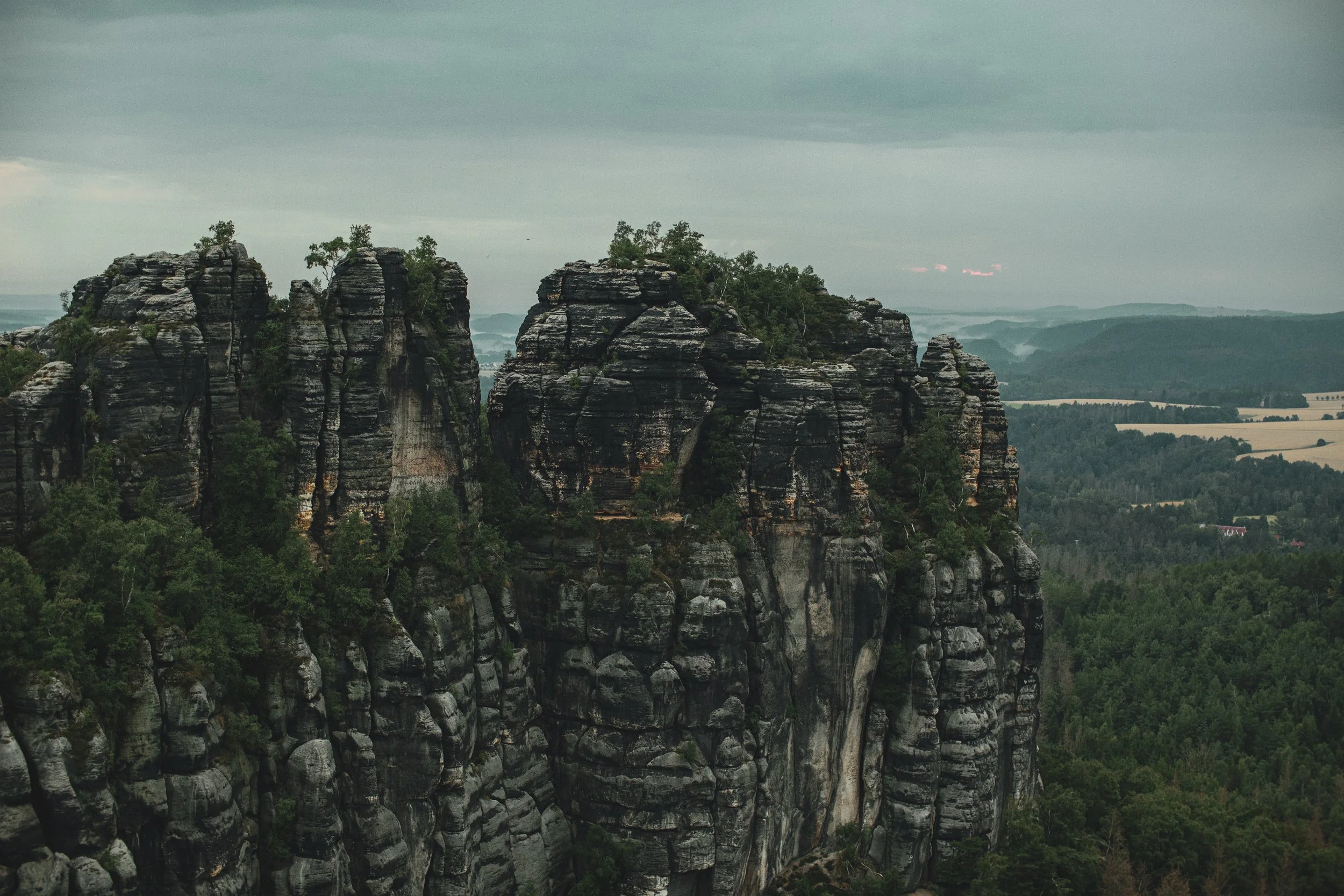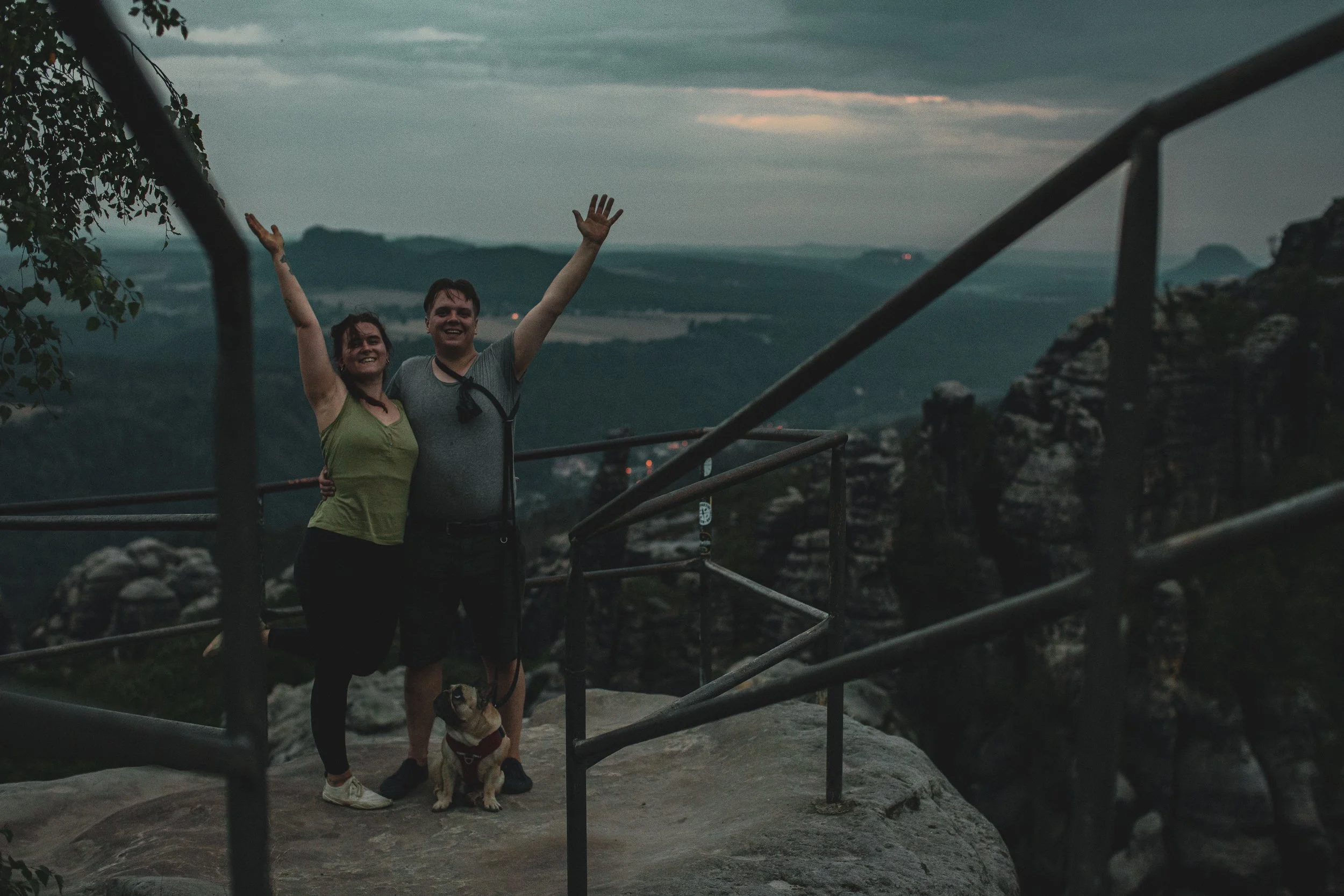 Die Sonne ging unter als wir die Schrammsteinaussicht erreichten. Wir waren beide völlig erschöpft, Jonas’ hätte sich nach eigenen Aussagen am liebsten übergeben und ich hatte den krassesten Adrenalinkick. Wir ließen einen Jubelschrei los und genossen die wahrlich schöne Aussicht.