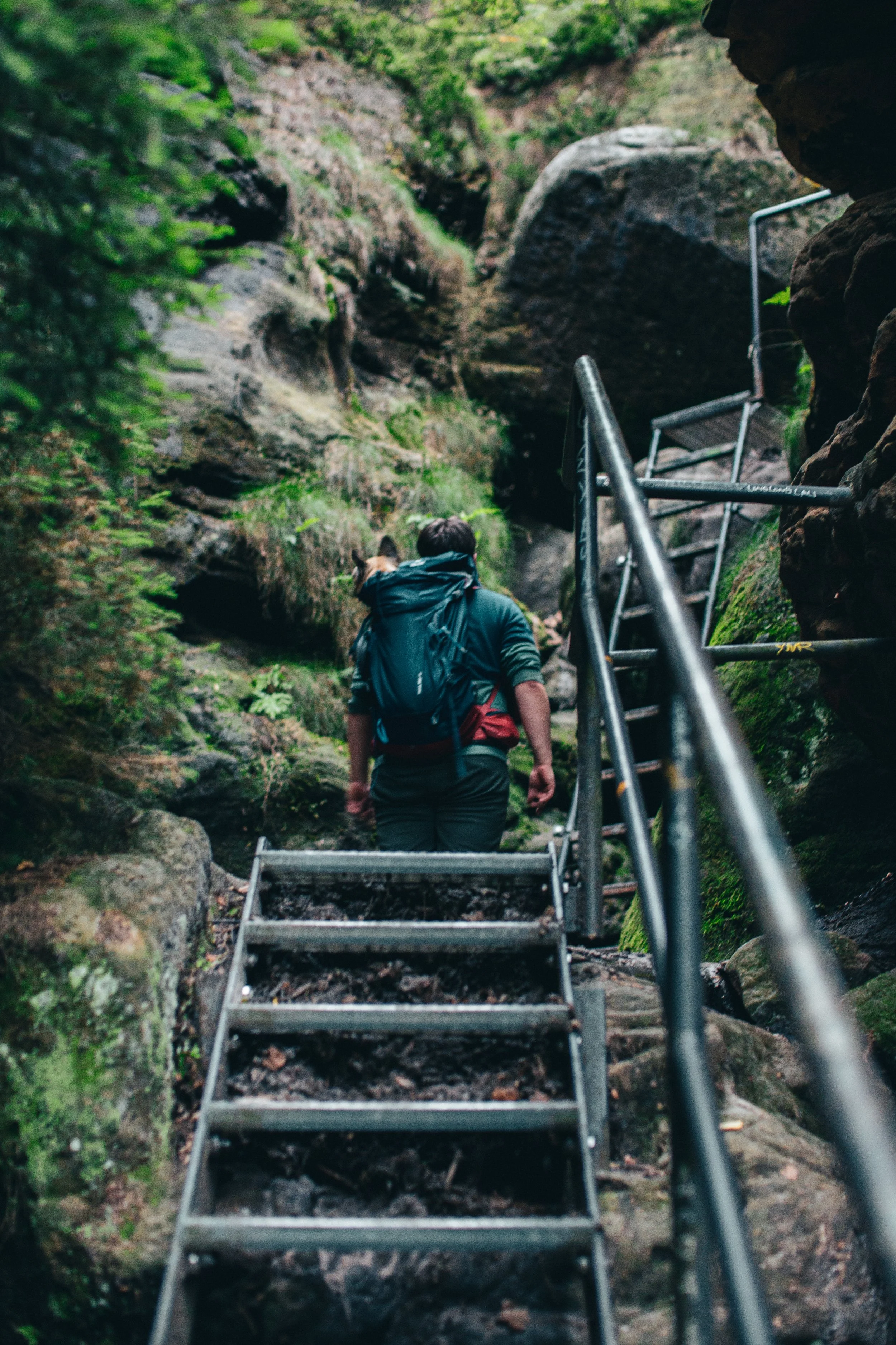 Am Fuße der Schrammsteine standen wir also - 417,2m sind die übrigens hoch. Soviel mussten wir zum Glück nicht erklimmen, aber es war mehr als genug und scheiß anstrengend. Die Luft war erdrückend warm und feucht. Wir schwitzten ohne abzukühlen und die Eisenleitern schienen kein Ende zu haben.
