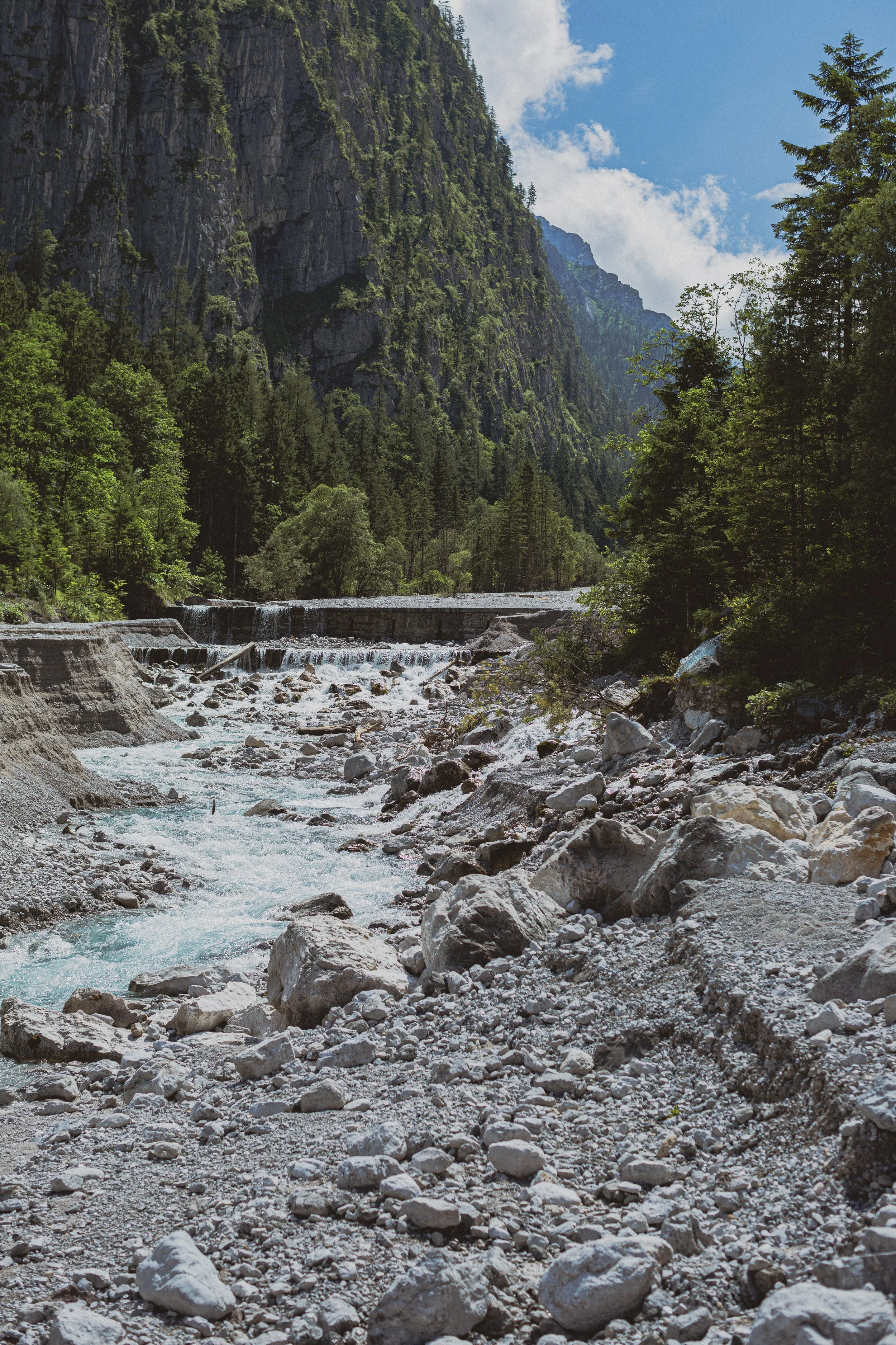 Auch das Berchtesgadener Land blieb nicht von Überschwemmungen verschont, so konnten wir die geplanten “Klamm” leider nicht besuchen. Stattdessen fuhren wir nach Ramsau, genauer gesagt zum Parkplatz der Wimbachbrücke. Wir hofften hier die Wimbachklamm zu besichtigen, aber auch diese war gesperrt und so gaben wir uns (ich sehr widerwillig) damit zufrieden nur entlang der Wimbach zum Wimbachschloss zu wandern.