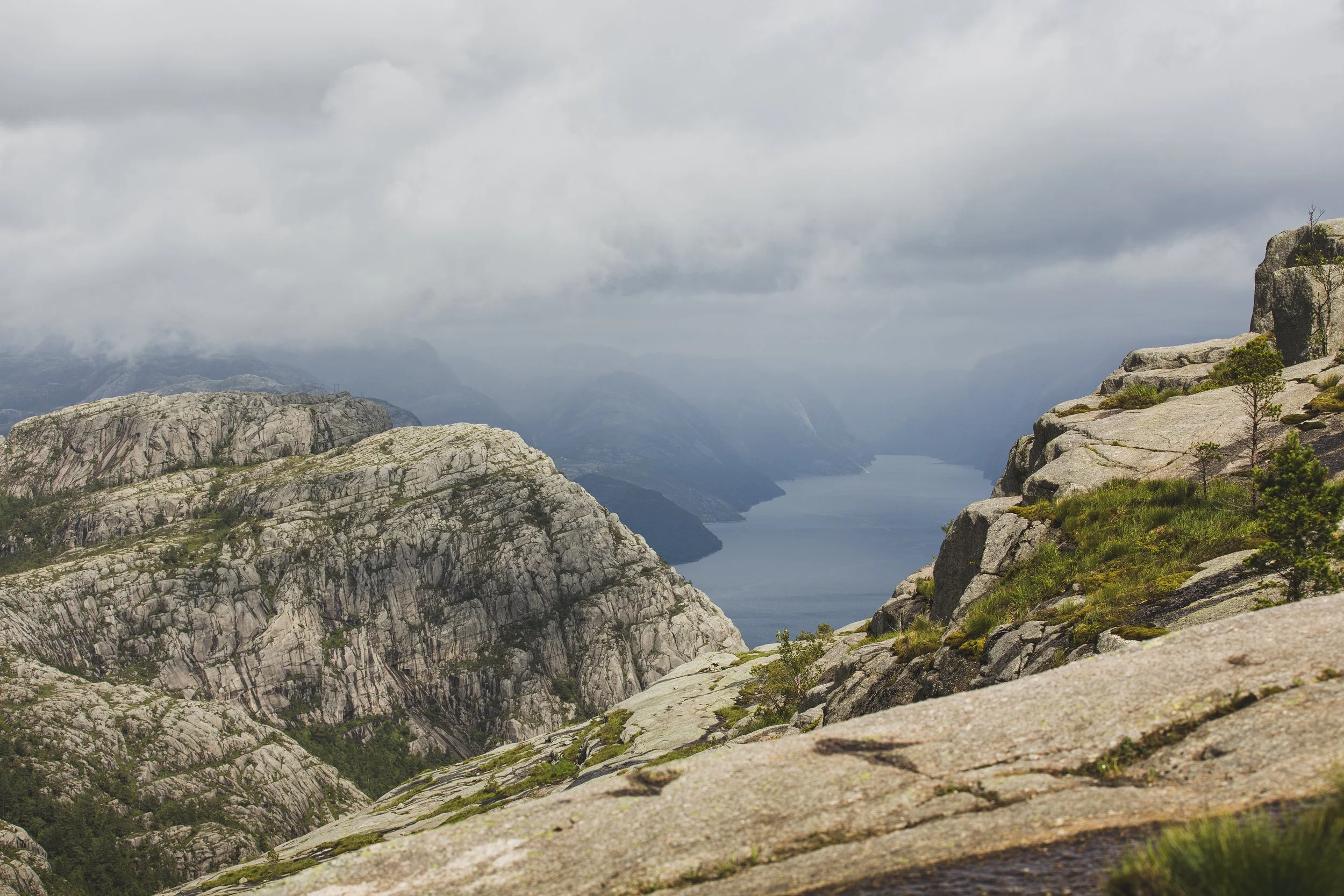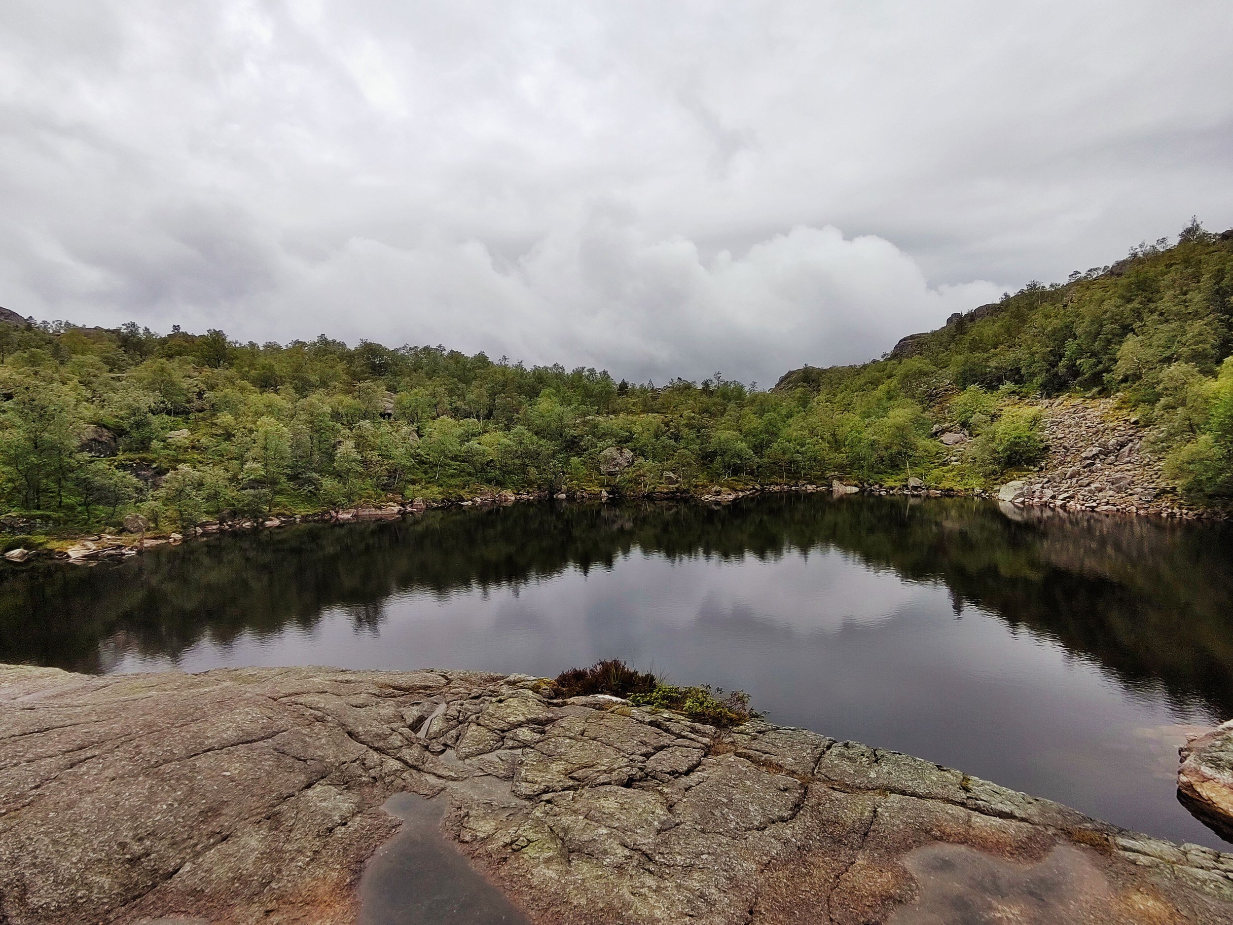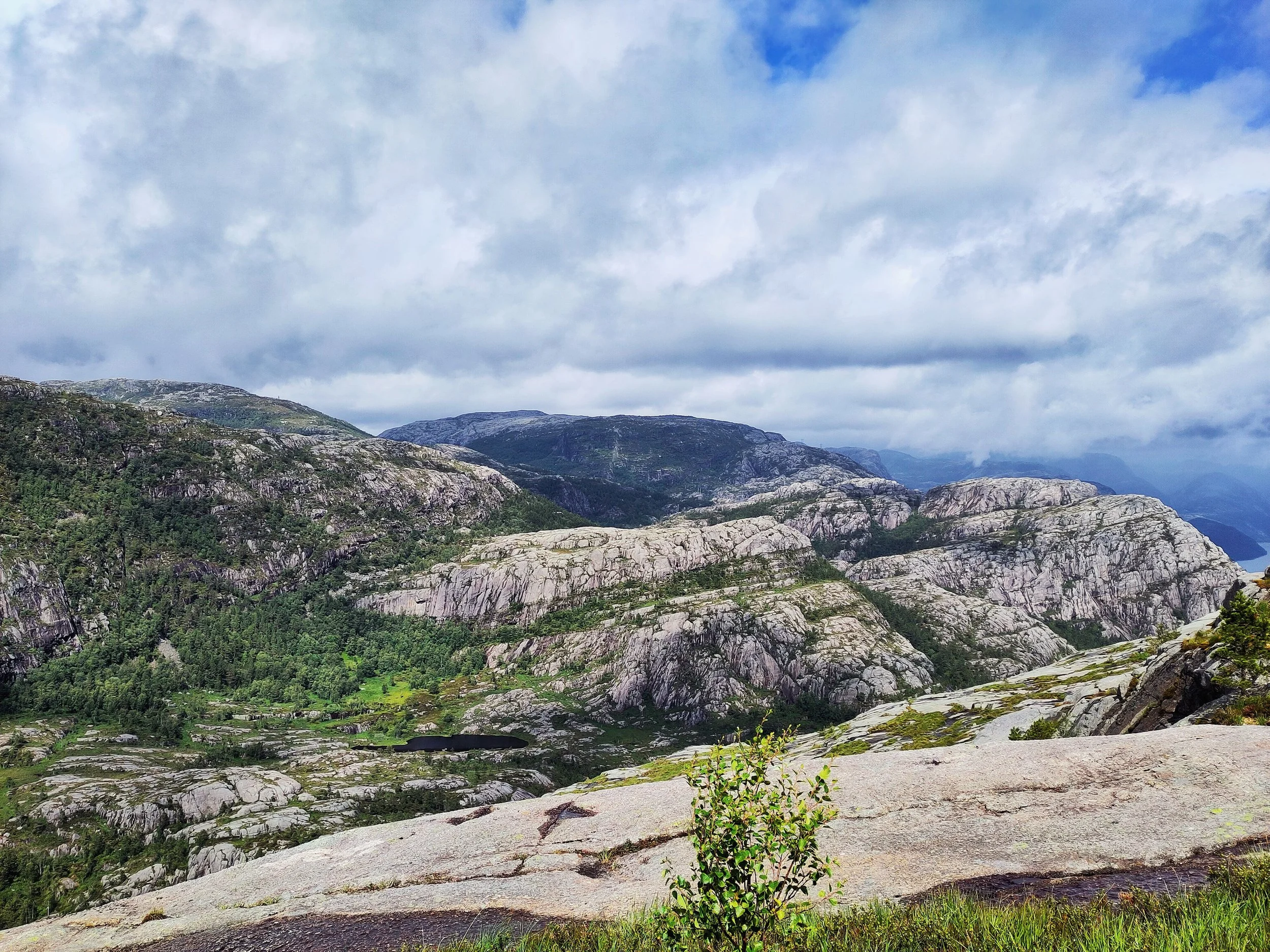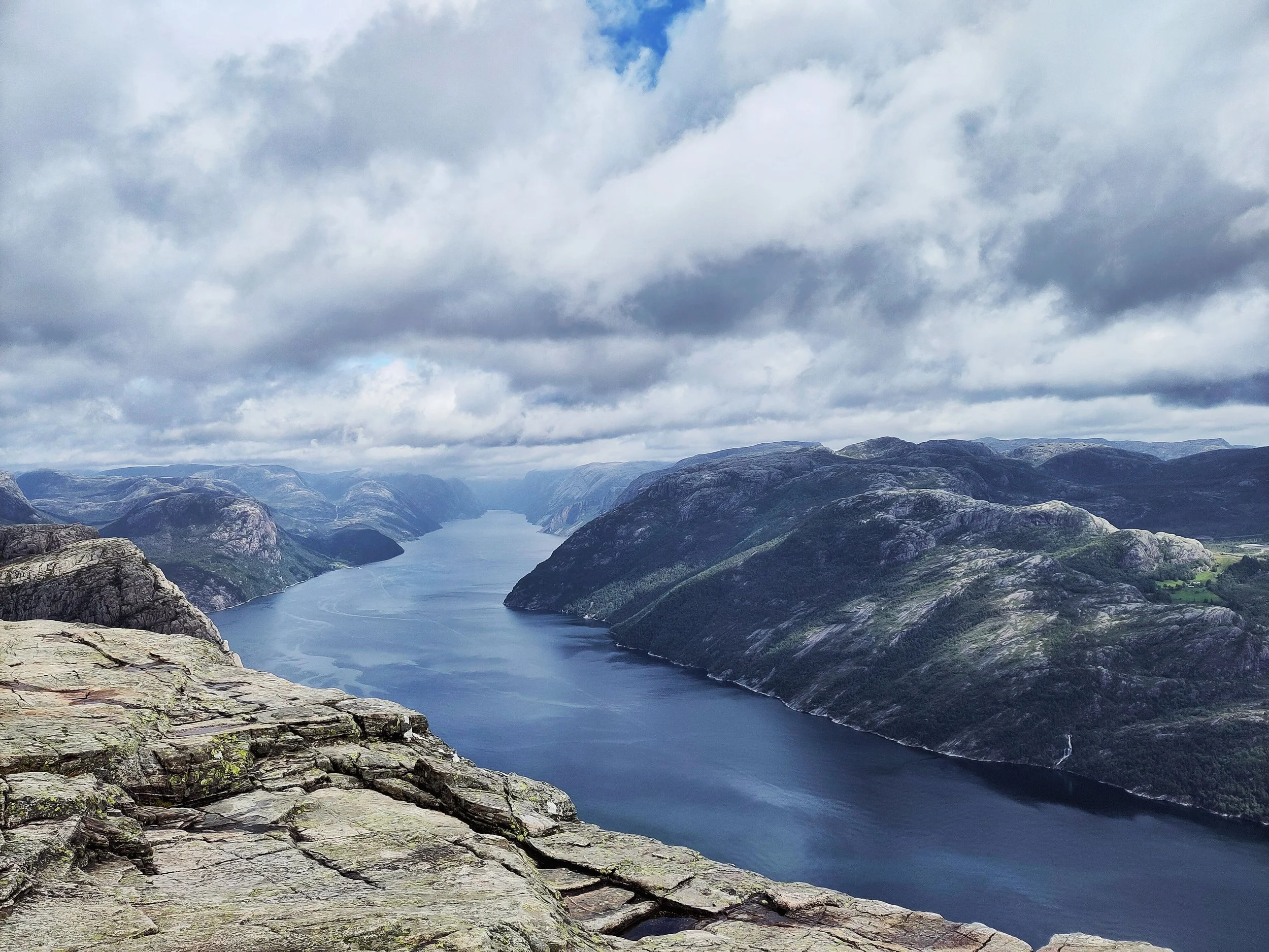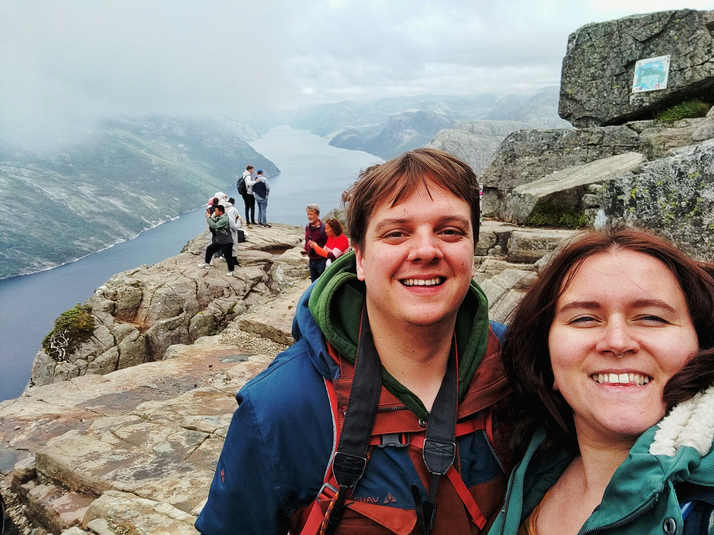 Aber das ist nicht alles. Nachdem wir oben angekommen waren, und diesen fabelhaften Ausblick genießen durften, gönnten wir uns eine ausgiebige Pause, um uns für den Abstieg vorzubereiten. Wir hatten unfassbar viel Glück mit dem Wetter, denn als wir ankamen, zog der Himmel auf und es war trocken und die Sicht frei. Kurz vorher war der ganze Preikestolen in Nebel gehüllt. Also haben wir zeitlich doch alles richtig gemacht.
