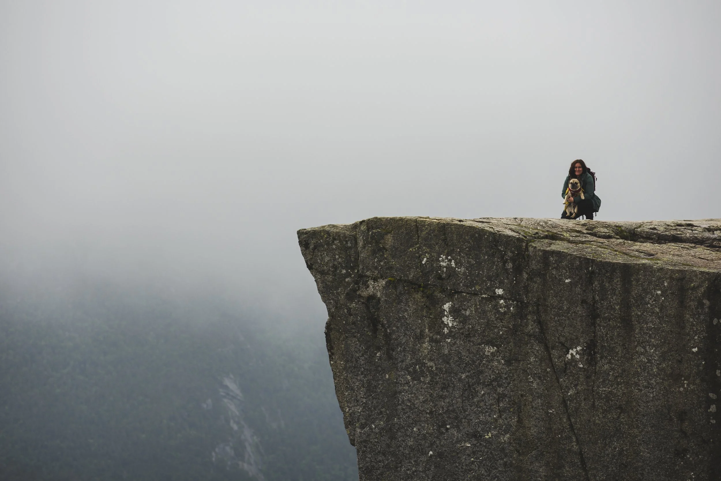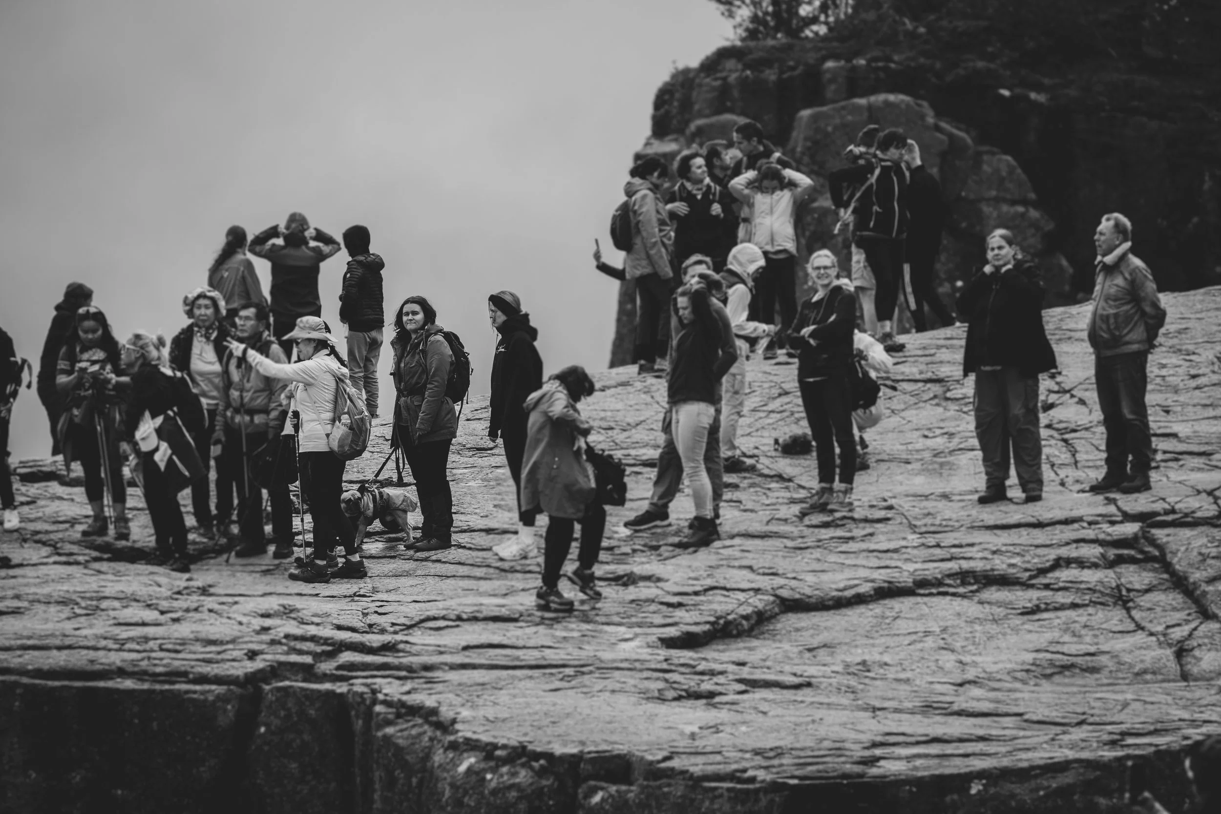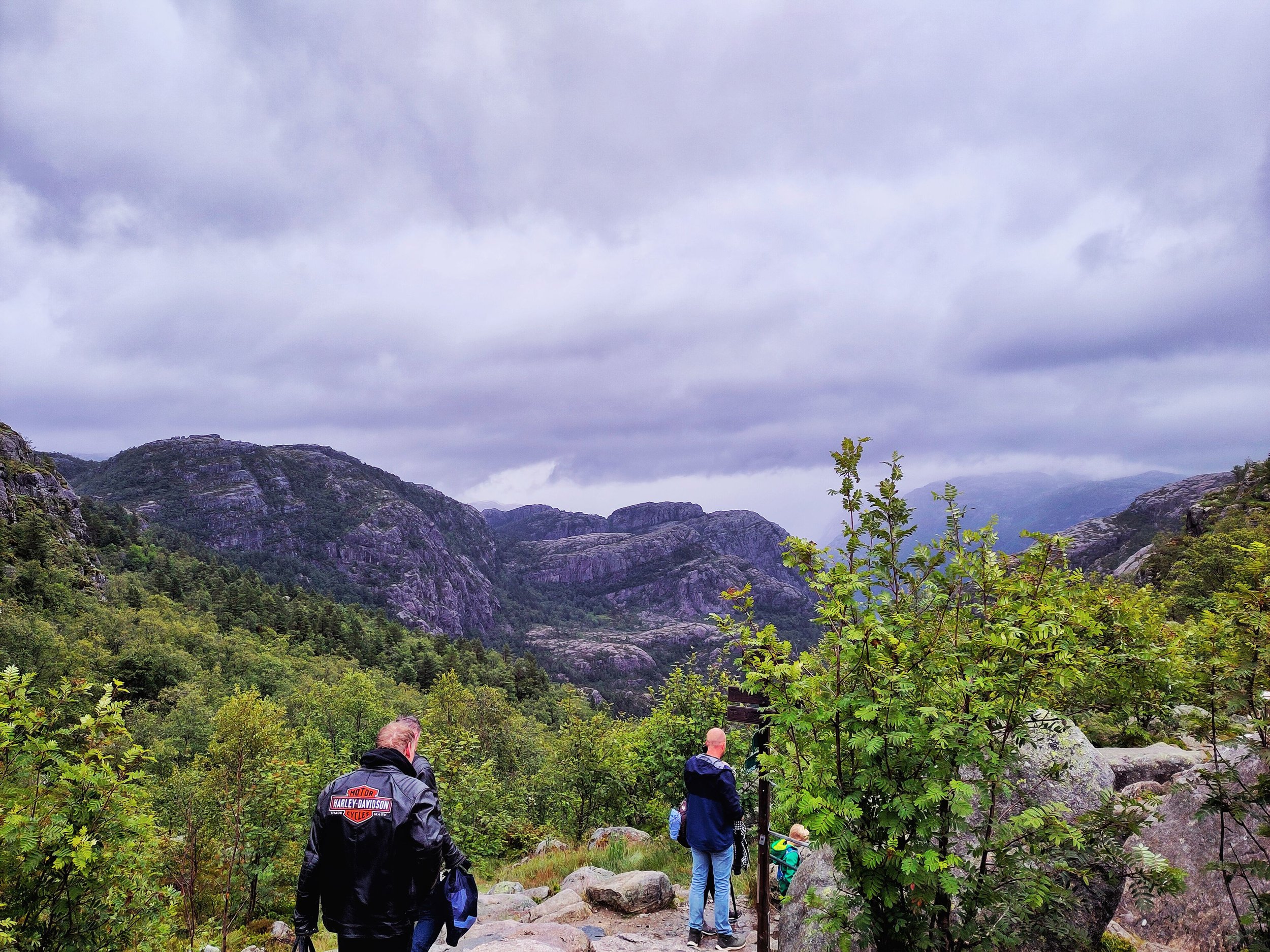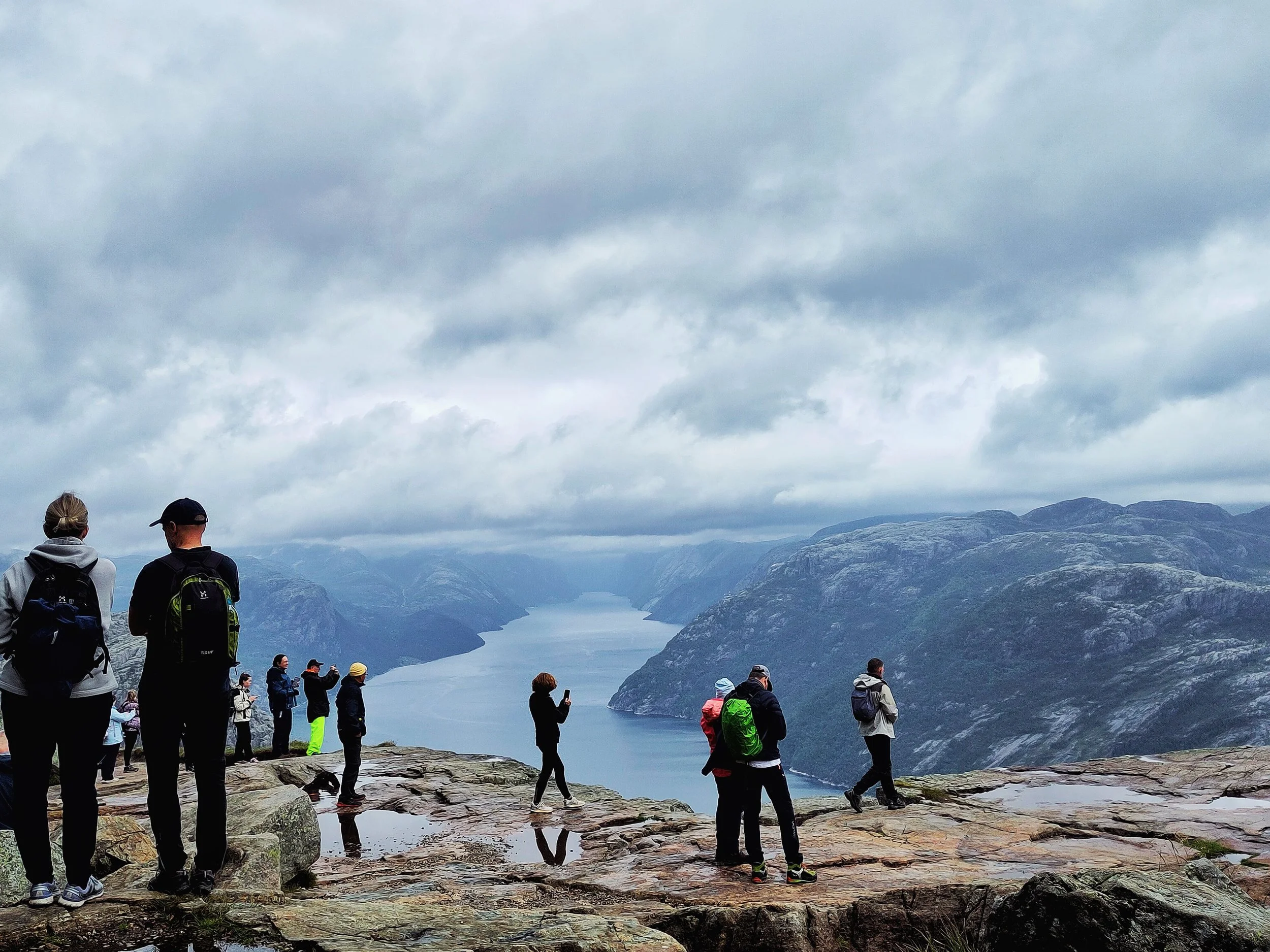 Der Preikestolen ist ein natürliches Felsplateau, das in 604 Metern Höhe über den Lysefjord herausragt. Wir wussten, es würde voll werden, da es sich um eine beliebte Touristenattraktion handelt. Selbst Menschen mit Gehstock und anderen Laufeinschränkungen kletterten die knapp 4 Kilometer rauf und natürlich auch wieder runter. Tatsächlich war es aber mal wieder ein wahres Phänomen, zu sehen, wie viele Reisebusse massenhaft Menschen ankarrten. Hier bedarf es viel Geduld, denn die Nettigkeiten gehen flöten, wenn Menschen sich eine Weile sportlich betätigen und es nicht so läuft, wie sie es gerne hätten. Also warteten wir immer geduldig, wenn uns Leute überholen wollten, mussten ausweichen, wenn die Menschen vor uns plötzlich stehen blieben, und brauchten extra starke Nerven, wenn manche ihre Hunde nicht unter Kontrolle hatten und diese wie wild an der Leine umherrissen. Es ist kein Wunder, dass an diesem Felsvorsprung auch mal Leute ihr Leben verlieren. Denn wie schon erwähnt: Manche Menschen werden ungeduldig und dann auch unvorsichtig. Auch wir haben ein paar Leute beobachten können, die wirklich fragwürdige und waghalsige Aktionen machten, nur um schneller voranzukommen.