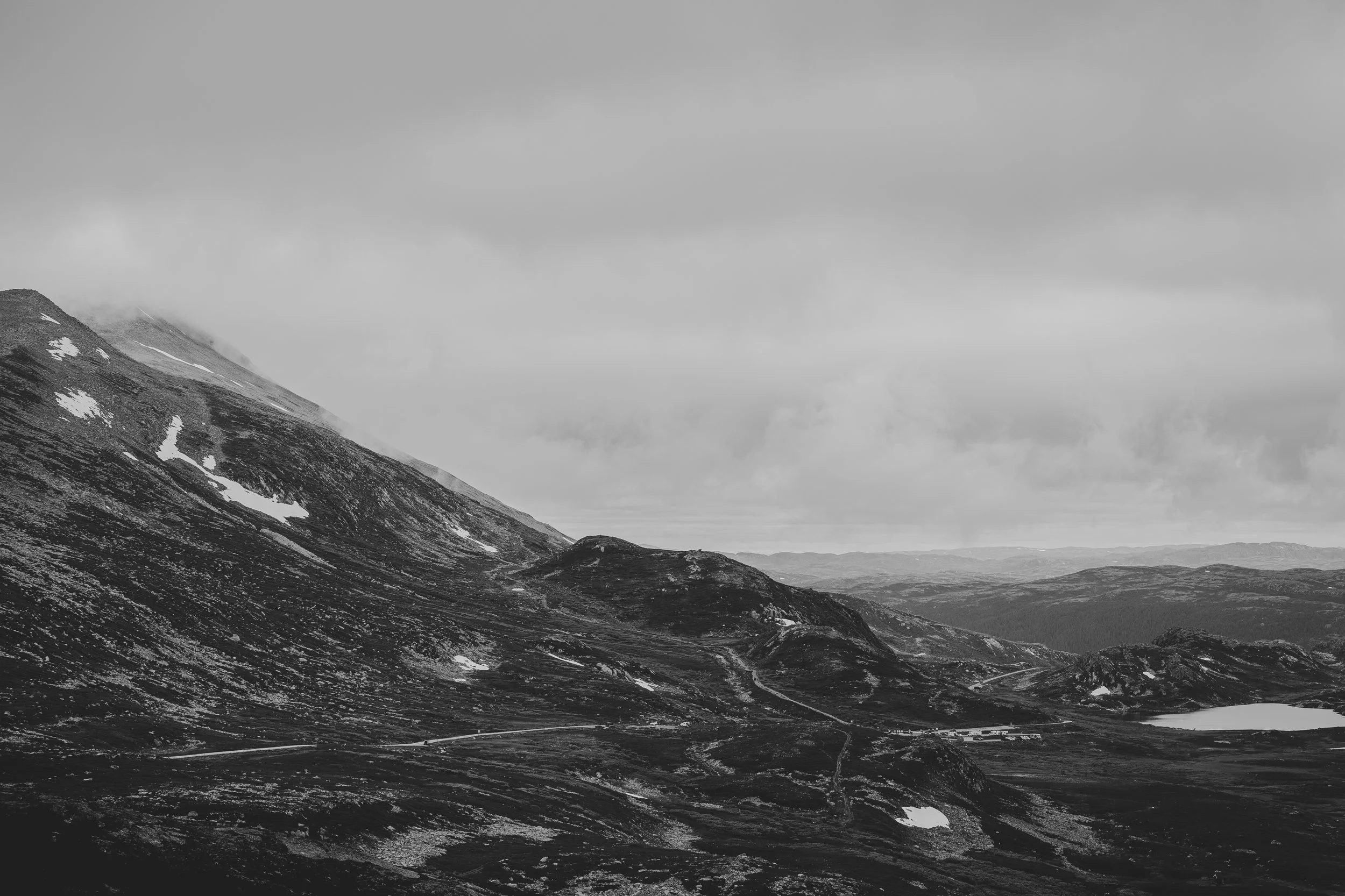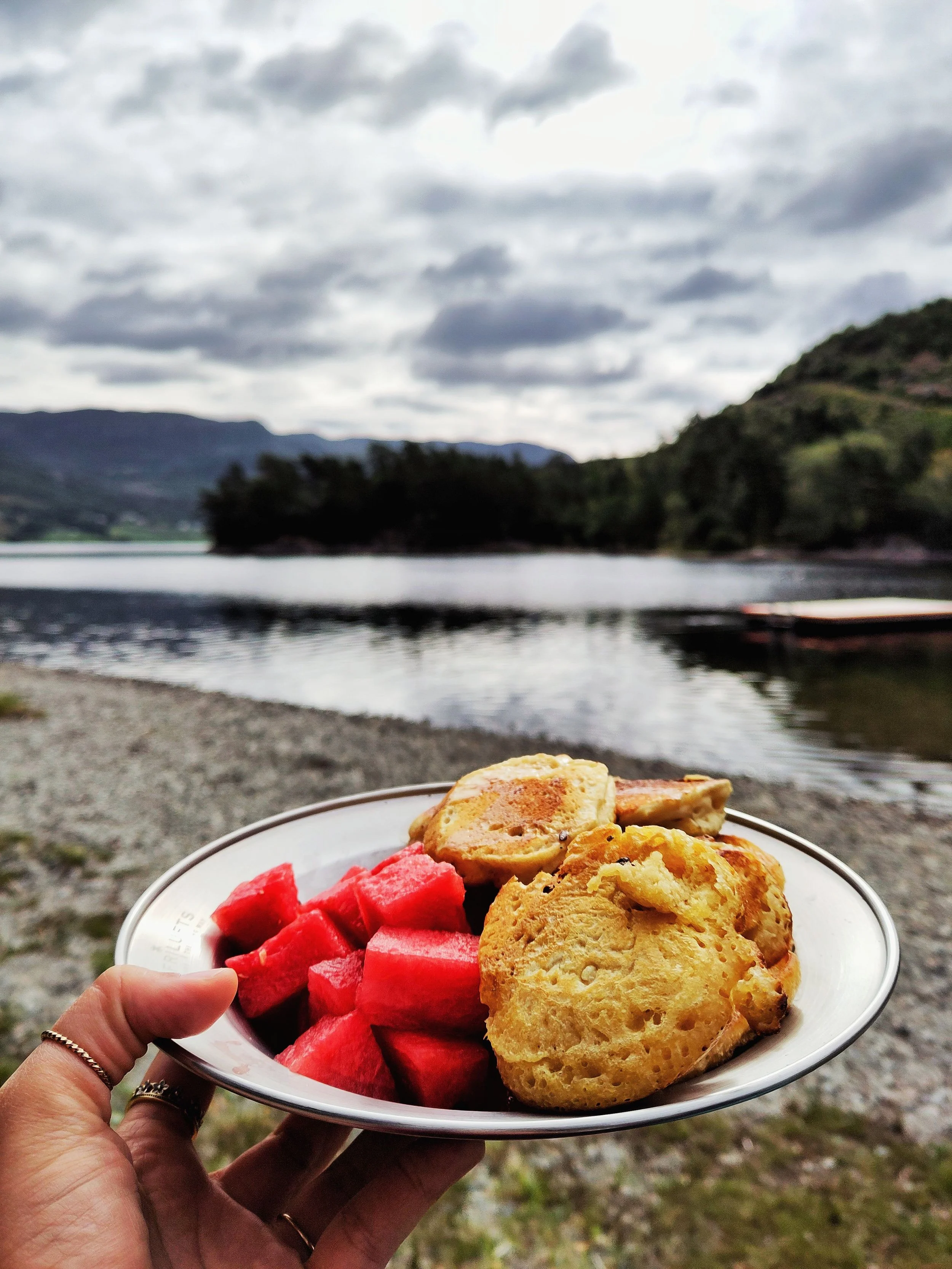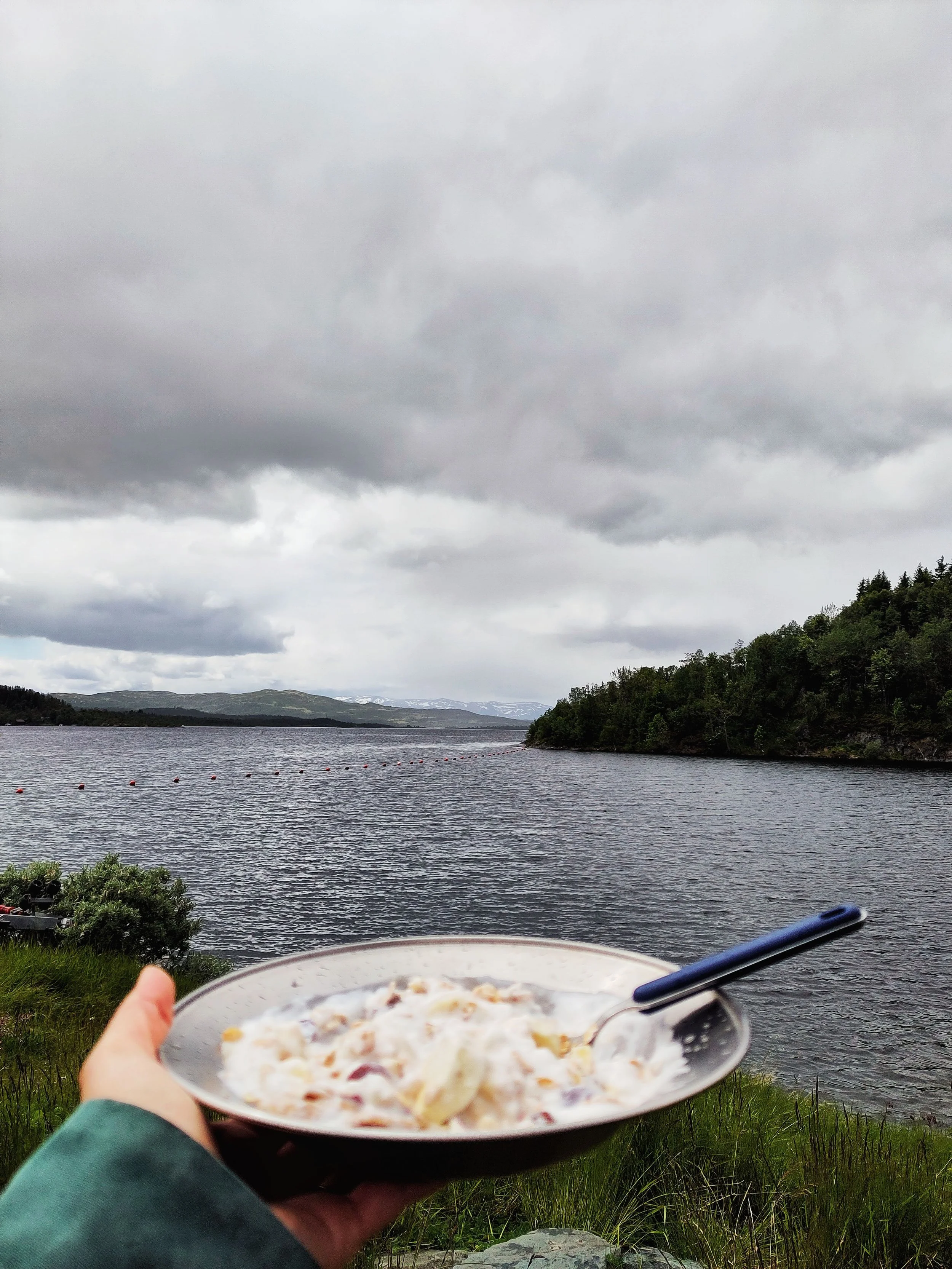 Aber irgendwann musste es auch weitergehen. Nachdem wir einem Plumpsklo einen Besuch abgestattet hatten, fuhren wir weiter zu einem kleinen Campingplatz, wo wir freundlich nach der Möglichkeit zu duschen fragten. Und tatsächlich, nachdem wir einen kleinen Preis gezahlt hatten, konnten wir uns beide frisch machen und den Mief loswerden. Die Route weiter entlang, sahen wir Wasserfälle, Berge und den Gaustatoppen von unten. Und erst gegen 14 Uhr hatten wir endlich Zeit und Raum, um zu frühstücken. Irgendwo auf einem Parkplatz, an einem See. Nichts Besonderes, aber wenigstens konnten wir endlich essen.