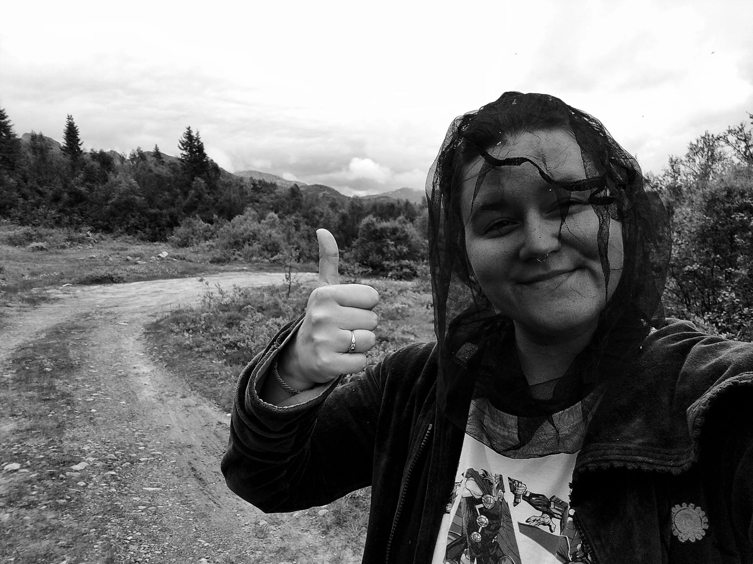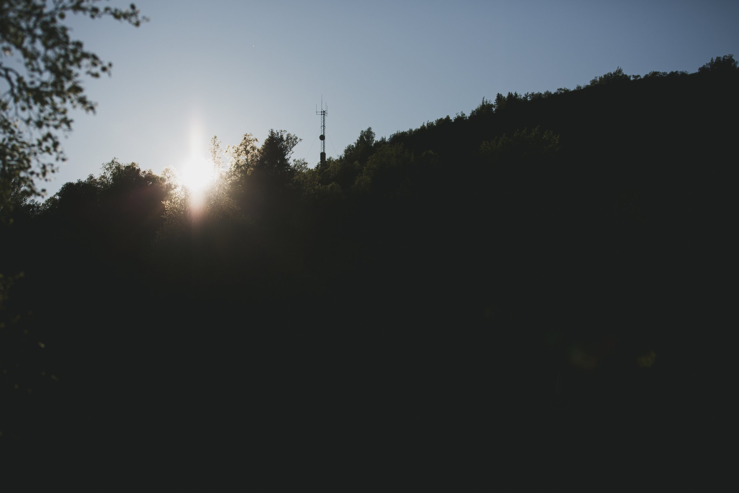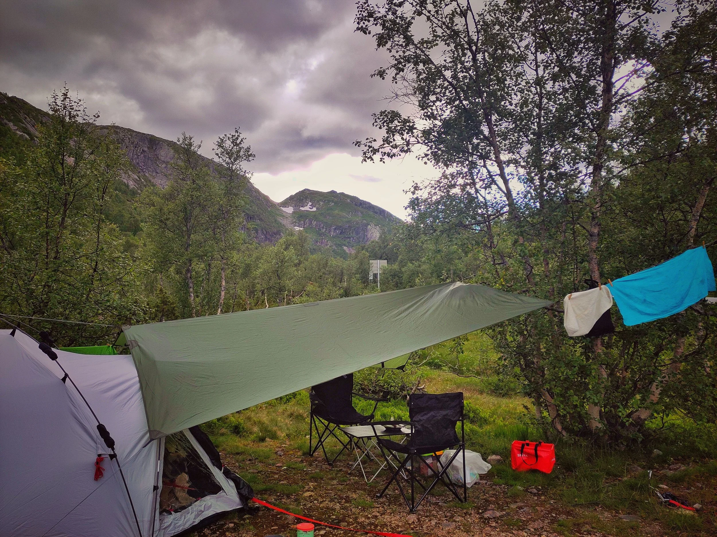 Um in der Nacht nicht wieder so zu frieren, fuhren wir mehr ins Tal. Zwischen zwei langen Bergketten fanden wir einen kleinen Parkplatz mit einer Umrandung aus jungen Bäumen, zwischen denen wir unser Zelt aufbauen und endlich auch unser schickes Tarp aufhängen konnten. Jonas meinte, es schütze vor Wind und Regen. Regen gab’s nicht, und vor Wind schützte es leider auch null, stattdessen buckelten wir wie Gollum unter dem Ungetüm von einem Tarp. Und auch hier trafen wir wieder auf Mücken, aber aufgrund des starken Windes wurden diese in die nächste Dimension gepustet.