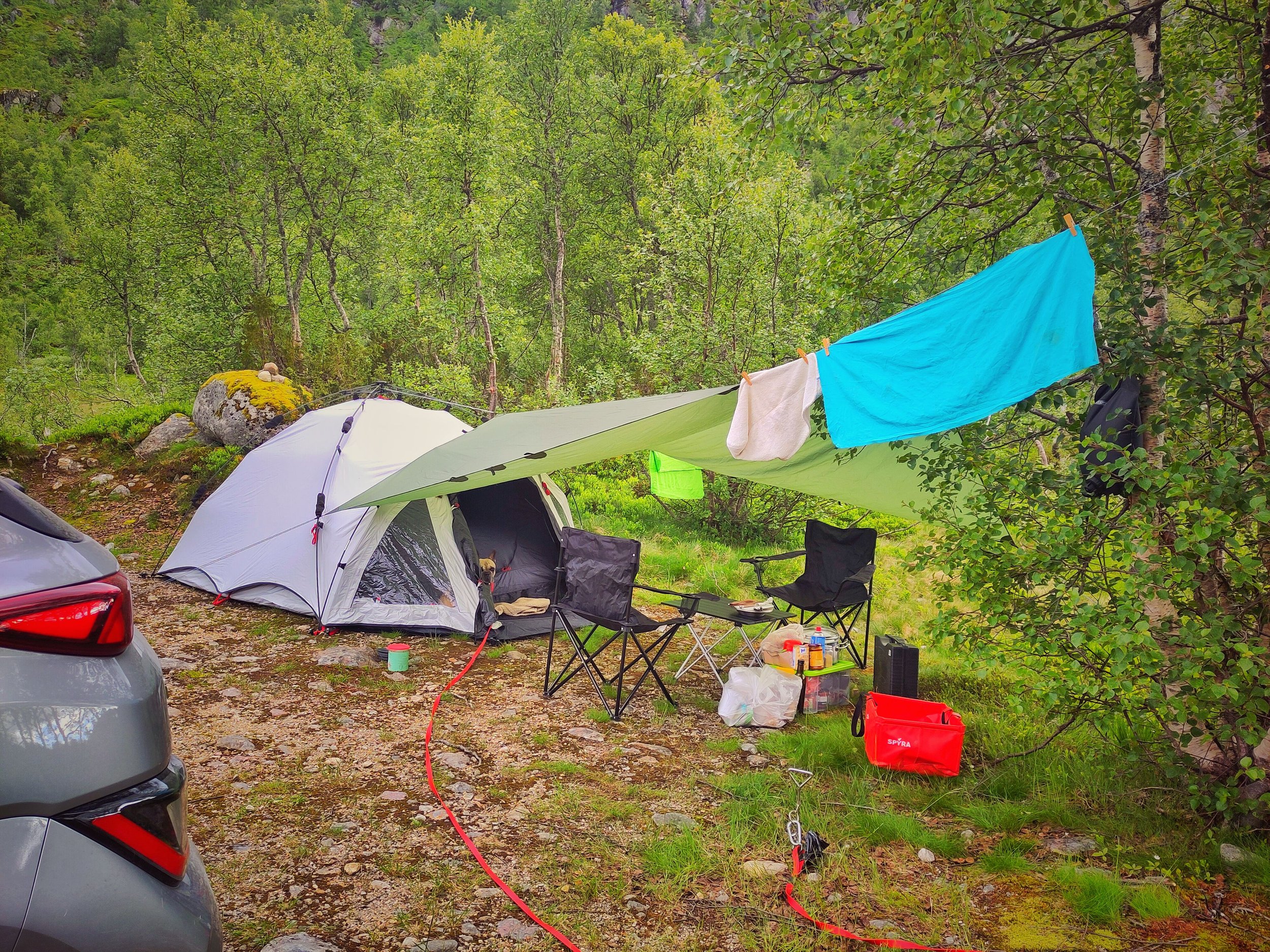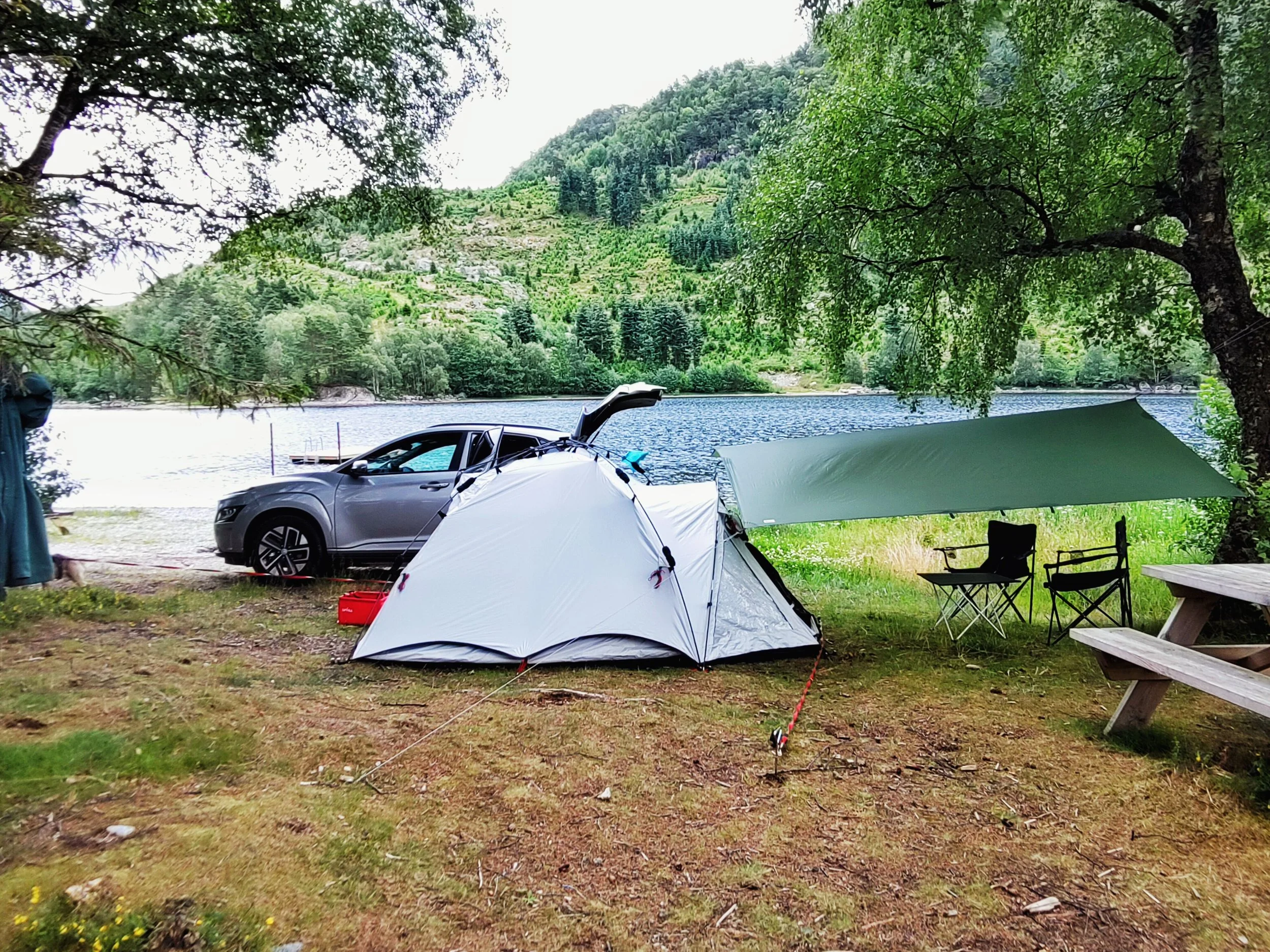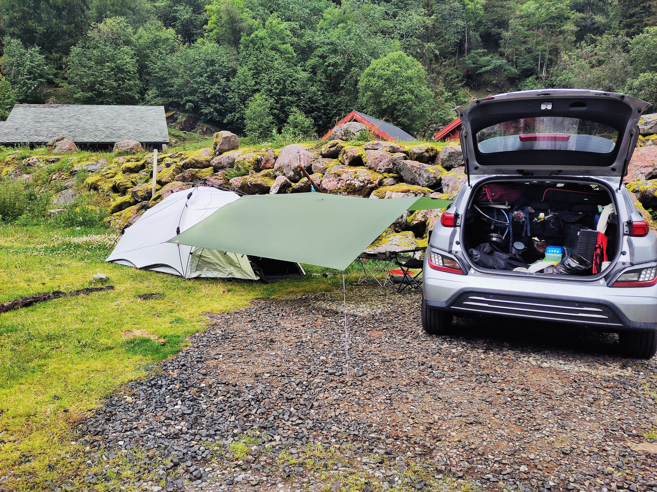 Wir steuerten einen Campingplatz auf der Insel Sokn an. Da wir für den nächsten Tag eine etwas größere Wanderung geplant hatten, wollten wir es uns mit der Schlafplatzsuche etwas einfacher machen. Außerdem musste ein wenig Wäsche gewaschen werden und ich konnte auch mal wieder eine heiße Dusche gebrauchen. Unser Stellplatz lag direkt hinter einem kleinen „Deich“, der uns ein wenig vor Wind und Wetter schützte. Trotzdem waren wir wieder im Gollum-Modus unter unserem Tarp. Diesmal war es zwischen Zelt und Auto aufgespannt, was erstmal ein langer Prozess war, da unser Auto nicht mal eben über irgendwelche D-Ringe oder Ähnliches verfügt, an dem man Seile befestigen könnte. Tatsächlich dauert es an diesem Tag dann am längsten, alles aufzubauen. Und als wir dann endlich fertig waren, wollte ich mit dem Kochen beginnen. Doch leider fiel der Gaskocher immer wieder aus. Wir dachten erst, es läge vielleicht am Wind, also versuchten wir, das Gerät etwas geschützter hinzustellen. Aber bedauerlicherweise half das gar nichts und unser Essen lag kalt in der Pfanne, während die letzte Flamme erlosch. Das Gas unserer Kartuschen hat sich verflüchtigt. Wir hatten 4 Kartuschen dabei, und keine funktionierte mehr – obwohl sie nie benutzt worden waren! Und jetzt? Tja, das Tarp wieder abbauen, zumindest den Teil, der am Auto ist, und dann neue Kartuschen besorgen – kurz vor Ladenschluss. Jonas düste durch die Gegend, bis er irgendwann einen Laden fand, der tatsächlich diese Form von Gas verkaufte, und nahm erstmal alle mit, die er tragen konnte. Währenddessen entspannte ich im Zelt und nickte hin und wieder ein. Als Jonas dann wiederkam, brutzelte ich unser Essen in Windeseile fertig und wir konnten leckere vegane Ente mit Udon-Nudeln genießen.