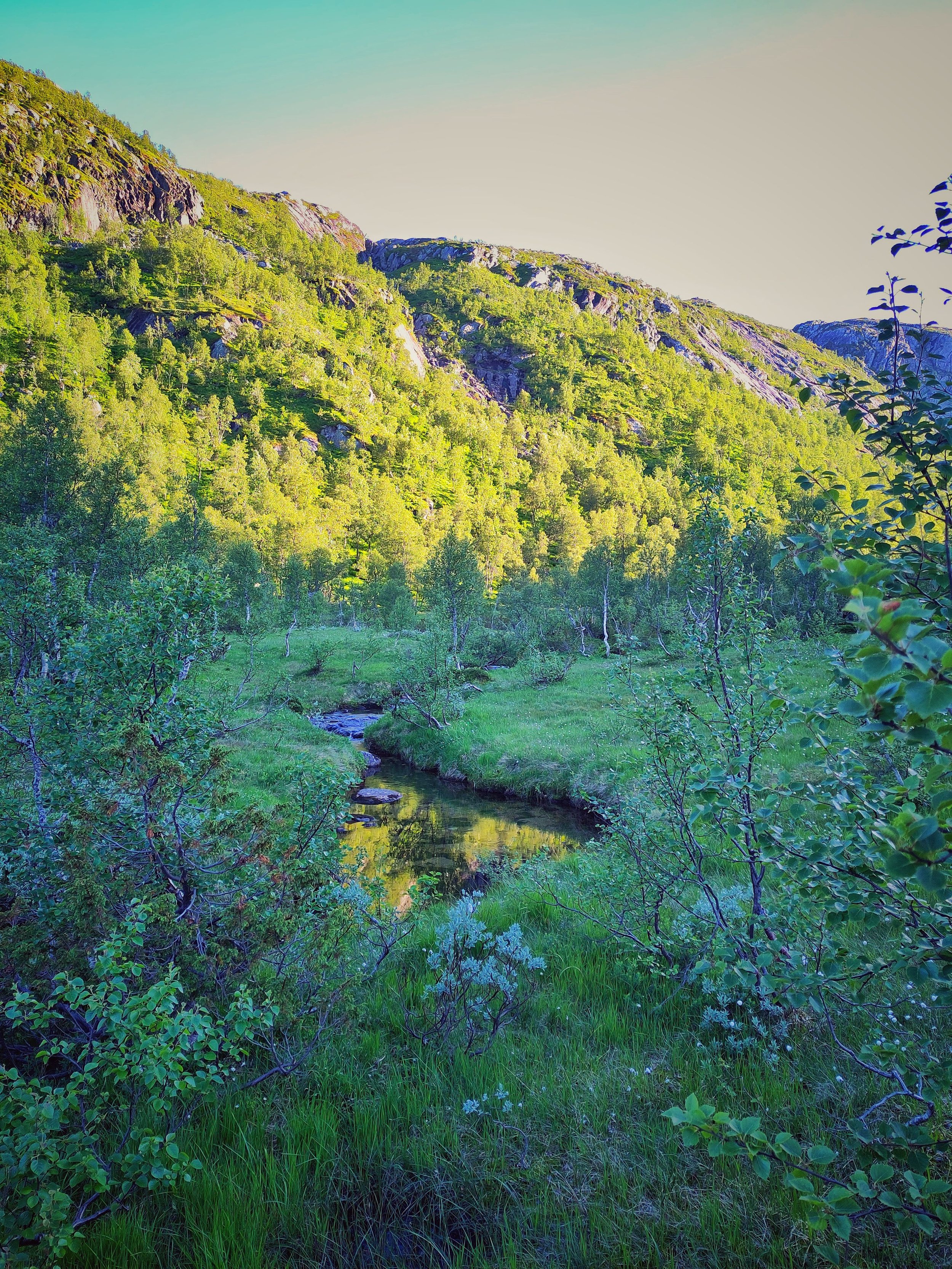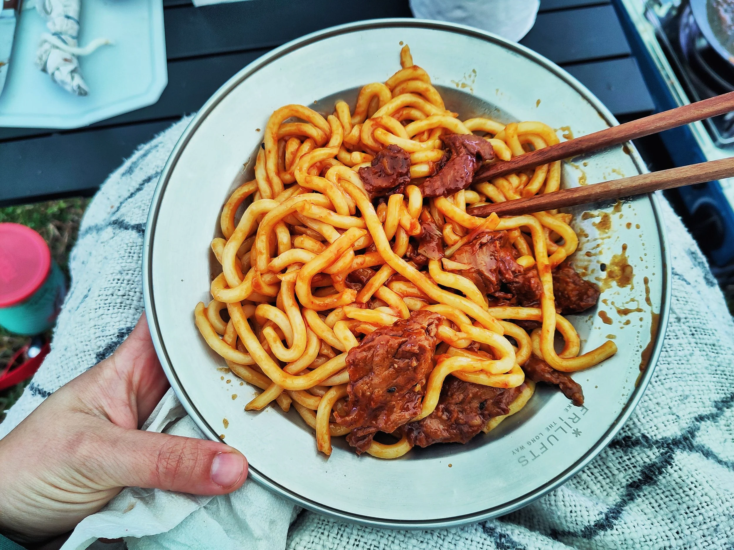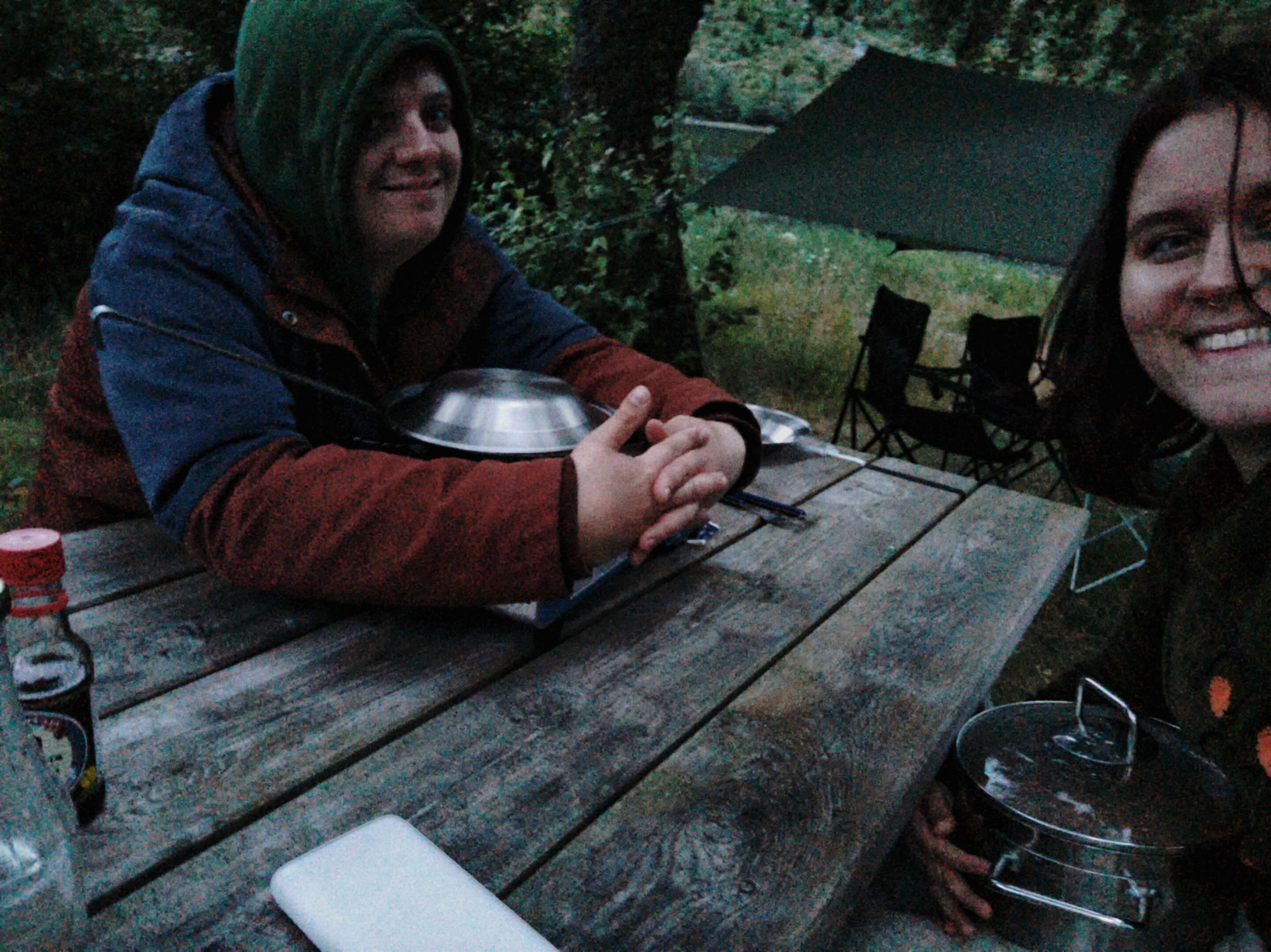 Wir steuerten einen Campingplatz auf der Insel Sokn an. Da wir für den nächsten Tag eine etwas größere Wanderung geplant hatten, wollten wir es uns mit der Schlafplatzsuche etwas einfacher machen. Außerdem musste ein wenig Wäsche gewaschen werden und ich konnte auch mal wieder eine heiße Dusche gebrauchen. Unser Stellplatz lag direkt hinter einem kleinen „Deich“, der uns ein wenig vor Wind und Wetter schützte. Trotzdem waren wir wieder im Gollum-Modus unter unserem Tarp. Diesmal war es zwischen Zelt und Auto aufgespannt, was erstmal ein langer Prozess war, da unser Auto nicht mal eben über irgendwelche D-Ringe oder Ähnliches verfügt, an dem man Seile befestigen könnte. Tatsächlich dauert es an diesem Tag dann am längsten, alles aufzubauen. Und als wir dann endlich fertig waren, wollte ich mit dem Kochen beginnen. Doch leider fiel der Gaskocher immer wieder aus. Wir dachten erst, es läge vielleicht am Wind, also versuchten wir, das Gerät etwas geschützter hinzustellen. Aber bedauerlicherweise half das gar nichts und unser Essen lag kalt in der Pfanne, während die letzte Flamme erlosch. Das Gas unserer Kartuschen hat sich verflüchtigt. Wir hatten 4 Kartuschen dabei, und keine funktionierte mehr – obwohl sie nie benutzt worden waren! Und jetzt? Tja, das Tarp wieder abbauen, zumindest den Teil, der am Auto ist, und dann neue Kartuschen besorgen – kurz vor Ladenschluss. Jonas düste durch die Gegend, bis er irgendwann einen Laden fand, der tatsächlich diese Form von Gas verkaufte, und nahm erstmal alle mit, die er tragen konnte. Währenddessen entspannte ich im Zelt und nickte hin und wieder ein. Als Jonas dann wiederkam, brutzelte ich unser Essen in Windeseile fertig und wir konnten leckere vegane Ente mit Udon-Nudeln genießen.