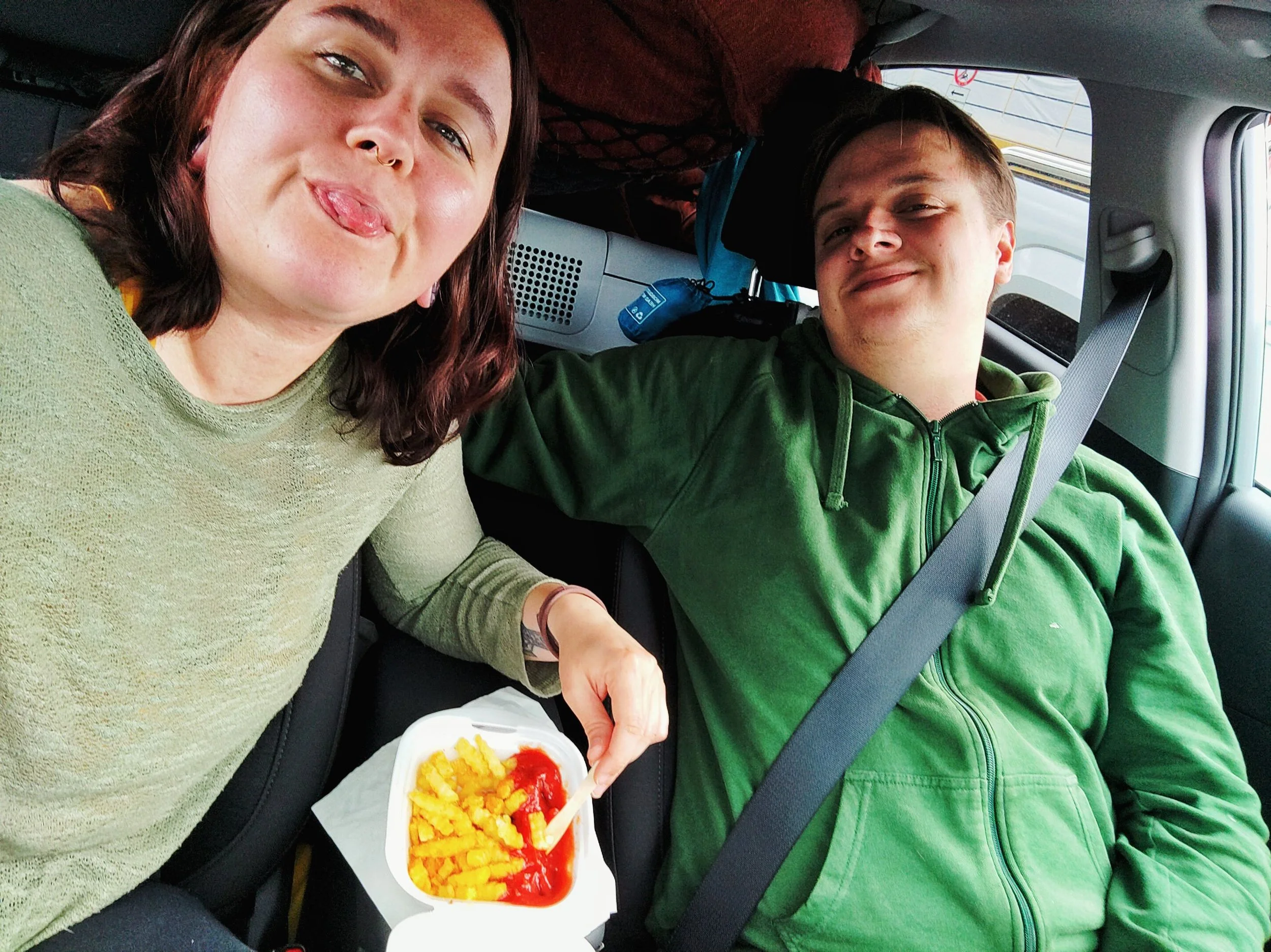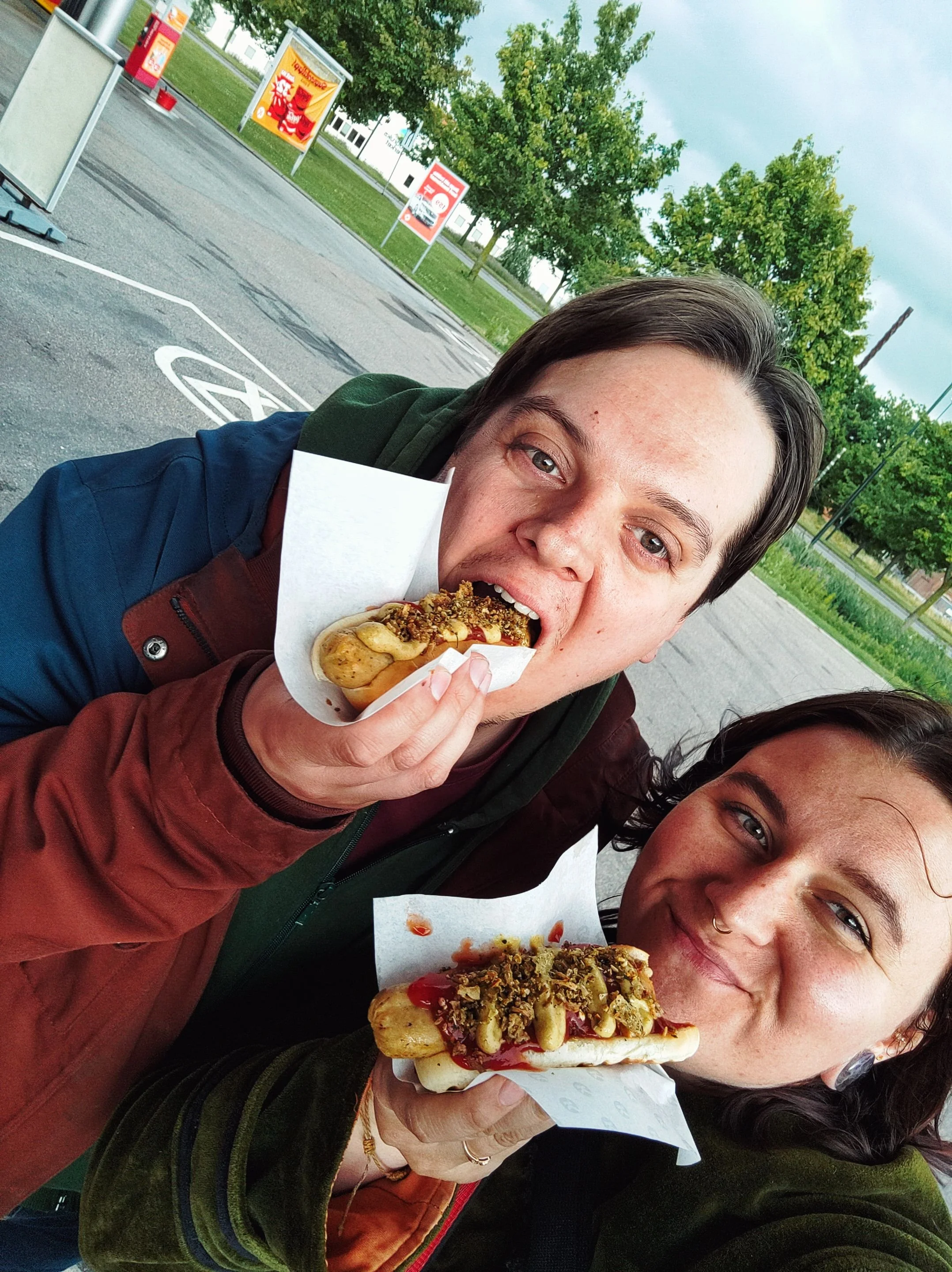 Um uns bei Laune zu halten, hielten wir regelmäßig an, um ordentlich zu essen. Nicht einfach nur unseren Proviant, sondern auch mal was Warmes wie Hot Dogs oder veganes Gebäck. Bei so einer anstrengenden Fahrt ist jedes Essen willkommen, Hauptsache Energie, um die Strecke zu schaffen.
