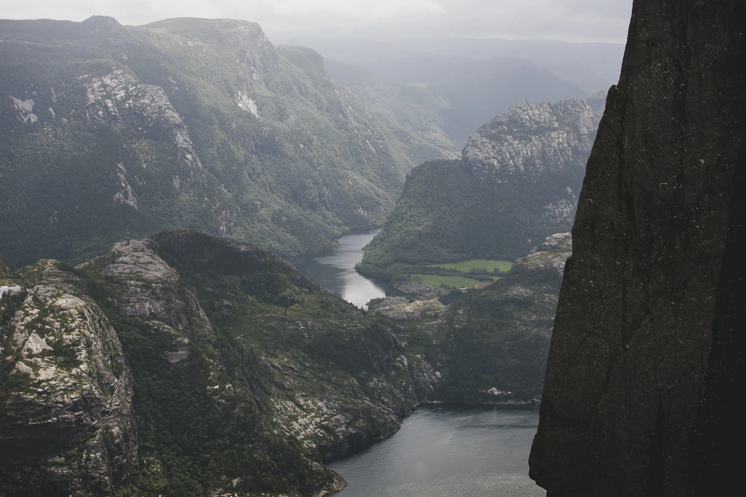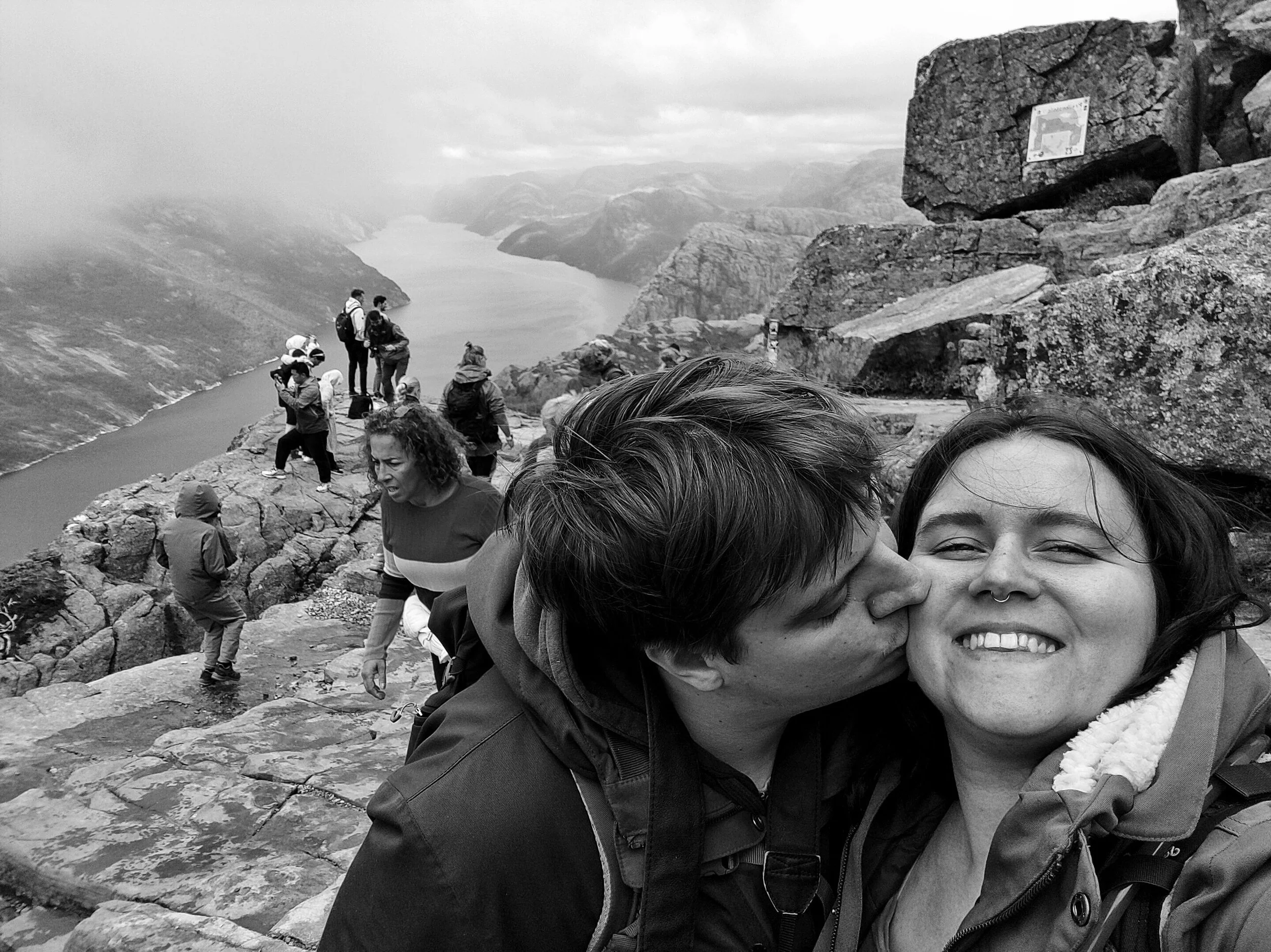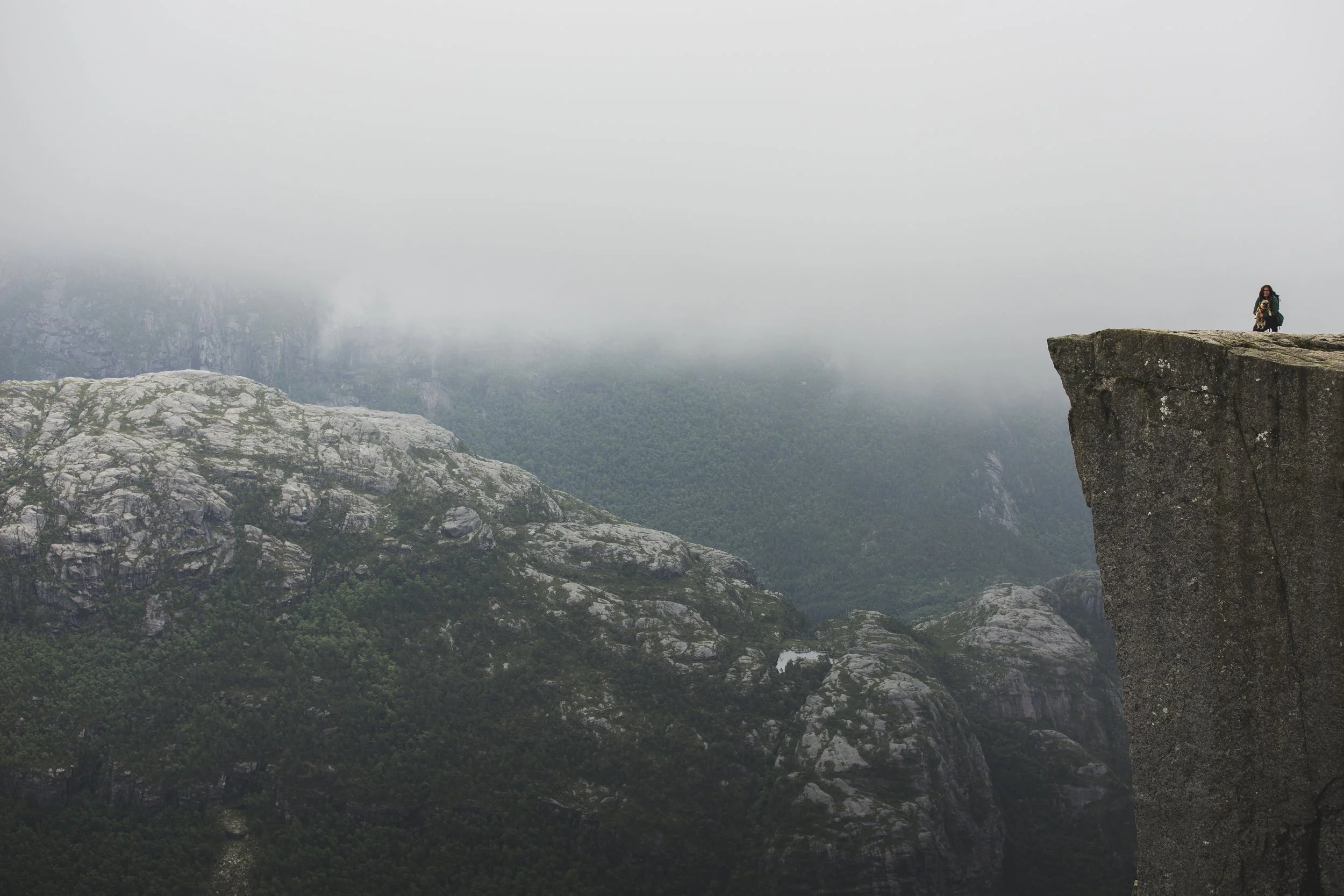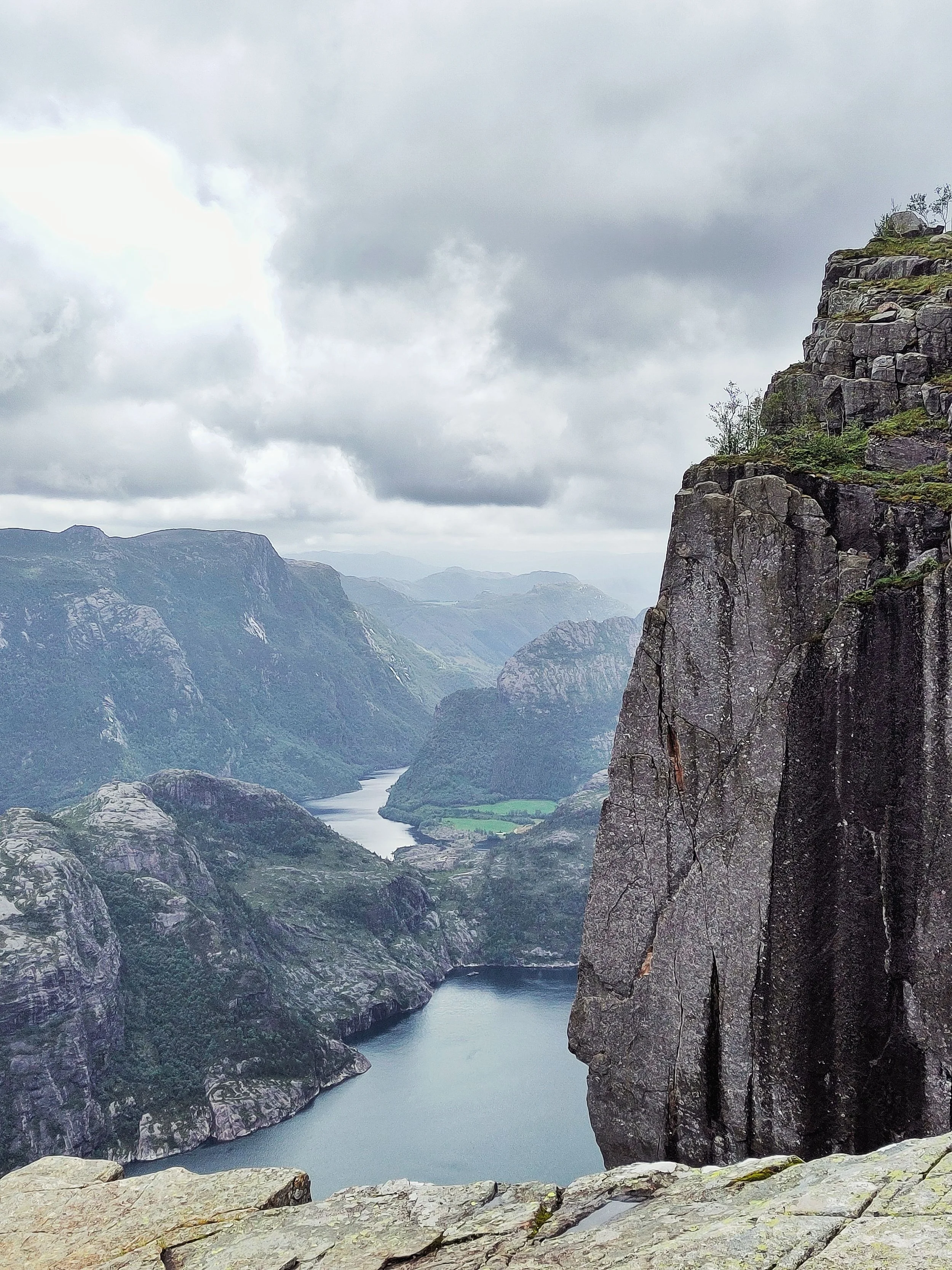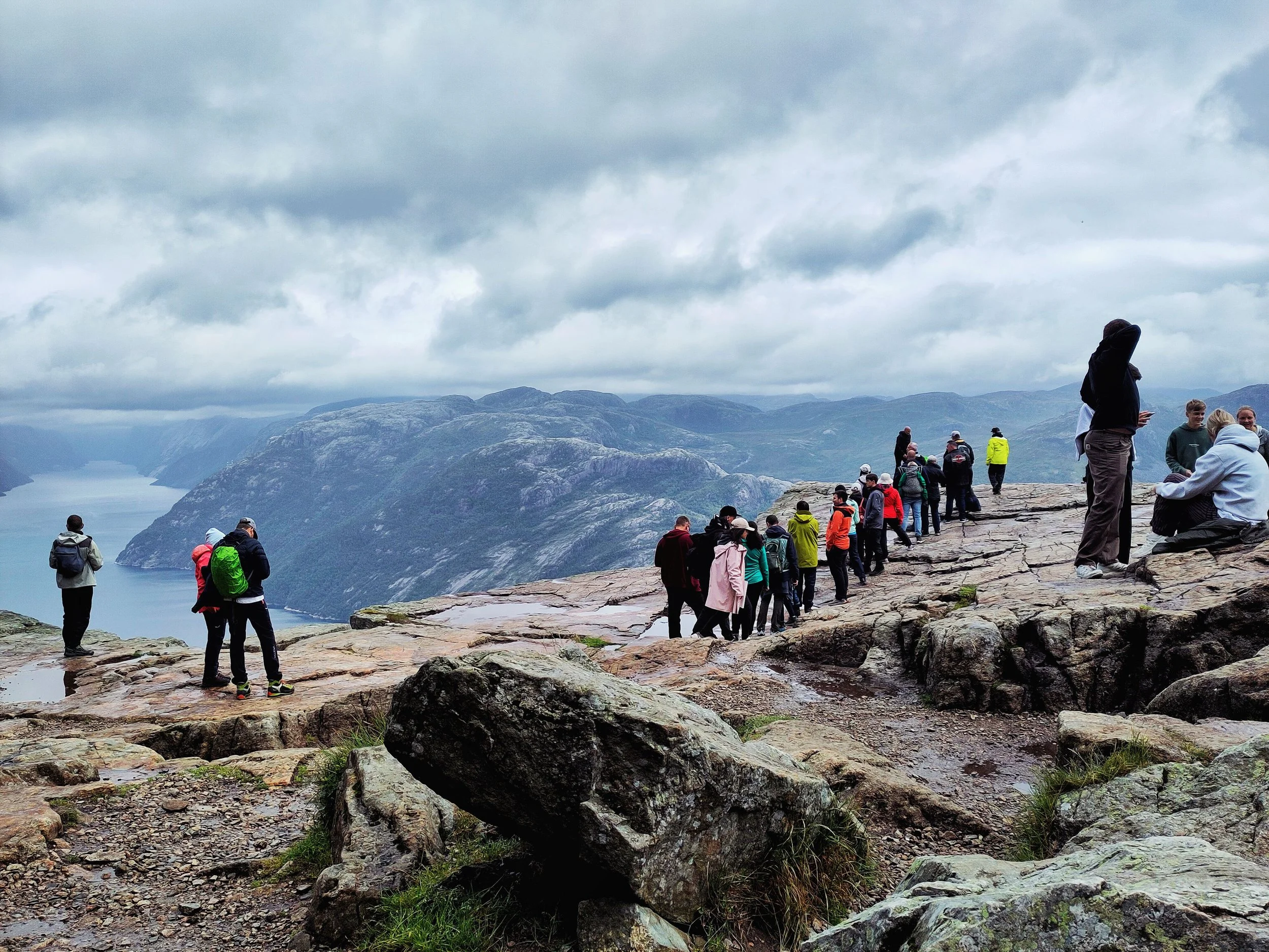 Und nun lasse ich nochmal die Moralapostel raushängen, denn als wir da so saßen, mit den anderen bestimmt 400–500 Menschen, bildete sich eine Schlange bei dem besten Fotospot. Ganz gesittet wartete jede Person auf ihren Moment im Rampenlicht, und manche waren der Ansicht, man könnte das ja besonders nutzen und für großes Aufsehen sorgen. So machte z.B. ein junger Mann dort, an der Spitze des Preikestolen – wo es senkrecht 604 Meter in den Abgrund geht – einen Handstand. Ein Raunen ging durch die Menschen, erschrockenes „clutching my pearls“-Atmen. Das reichte dem Typen jedoch nicht, er schob direkt noch einen Backflip hinterher, für den er tatsächlich von manchen Anwesenden einen Applaus erhielt. Und ich saß da auf meinem Stein und motzte vor mich hin, denn was der Jungspund da gerade gemacht hatte, war nicht nur unfassbar gefährlich, es war auch dermaßen dumm und egoistisch. Ich bin nicht auf einen Berg gestiegen, um dabei zuzusehen, wie ein Mensch in seinen Tod stürzt, danke, nein. Aber leider ist man an solchen Plätzen dieser Dummheit anderer ausgesetzt, und das macht mich echt sauer. Immerhin waren auch Kinder an diesem tollen Platz, und da Kinder ja nicht unbedingt für überlegte Handlungen bekannt sind, würde ich solch riskante Aktivitäten wirklich unterlassen… Ich hoffe, er hat ein tolles Insta-Bild dadurch bekommen und keine Menschen auf dem Gewissen, die dachten, sie könnten so einen Mist nachmachen.