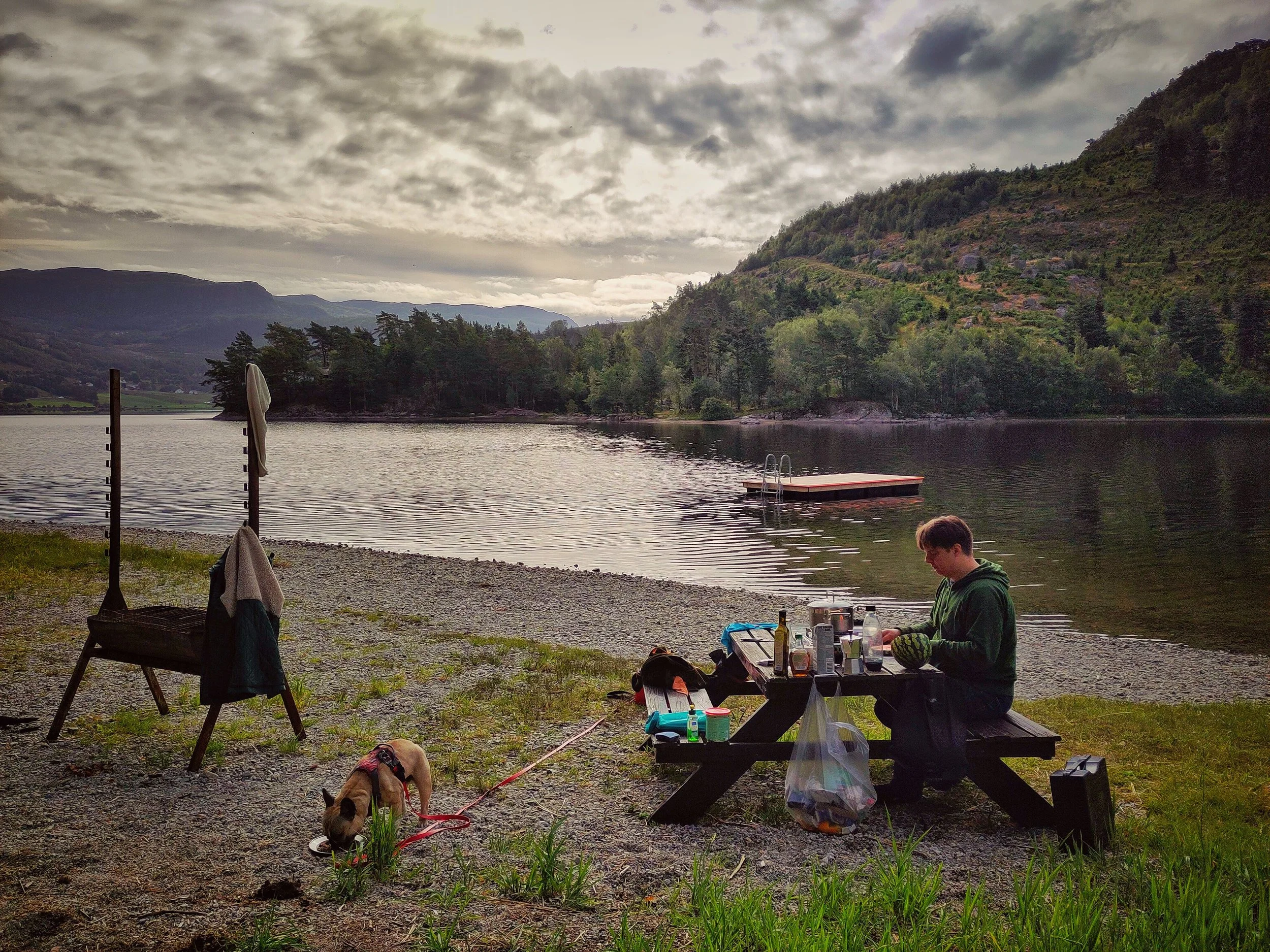 Und so begann wieder die Suche nach einem schönen Schlafplatz. Insgesamt waren wir an 4 möglichen Plätzen und die ersten 3 waren einfach nicht geil. Der eine Platz war voll mit Schafkot, und Atlas liebt es, sich in diesem zu wälzen. Also war das keine gute Idee. Wir fuhren immer weiter und weiter, bis wir irgendwann einen kleinen Rastplatz direkt neben der Straße entdeckten. Idyllisch gelegen an einem großen See, mit einem Toilettenhäuschen und einem Picknicktisch. Hier schlugen wir unser Zelt auf und lüfteten die nasse Kleidung aus. Das Abendessen zu kochen war dann wieder ein Abenteuer, da es diesmal wirklich zu windig für den Gaskocher war und Jonas mit vollem Körpereinsatz die Flammen versuchte zu schützen. Wir warteten bestimmt 1,5 Stunden, bis unsere Pasta endlich fertig war. Danach ging es direkt ins Bett, ausruhen von diesem aufregenden Tag.