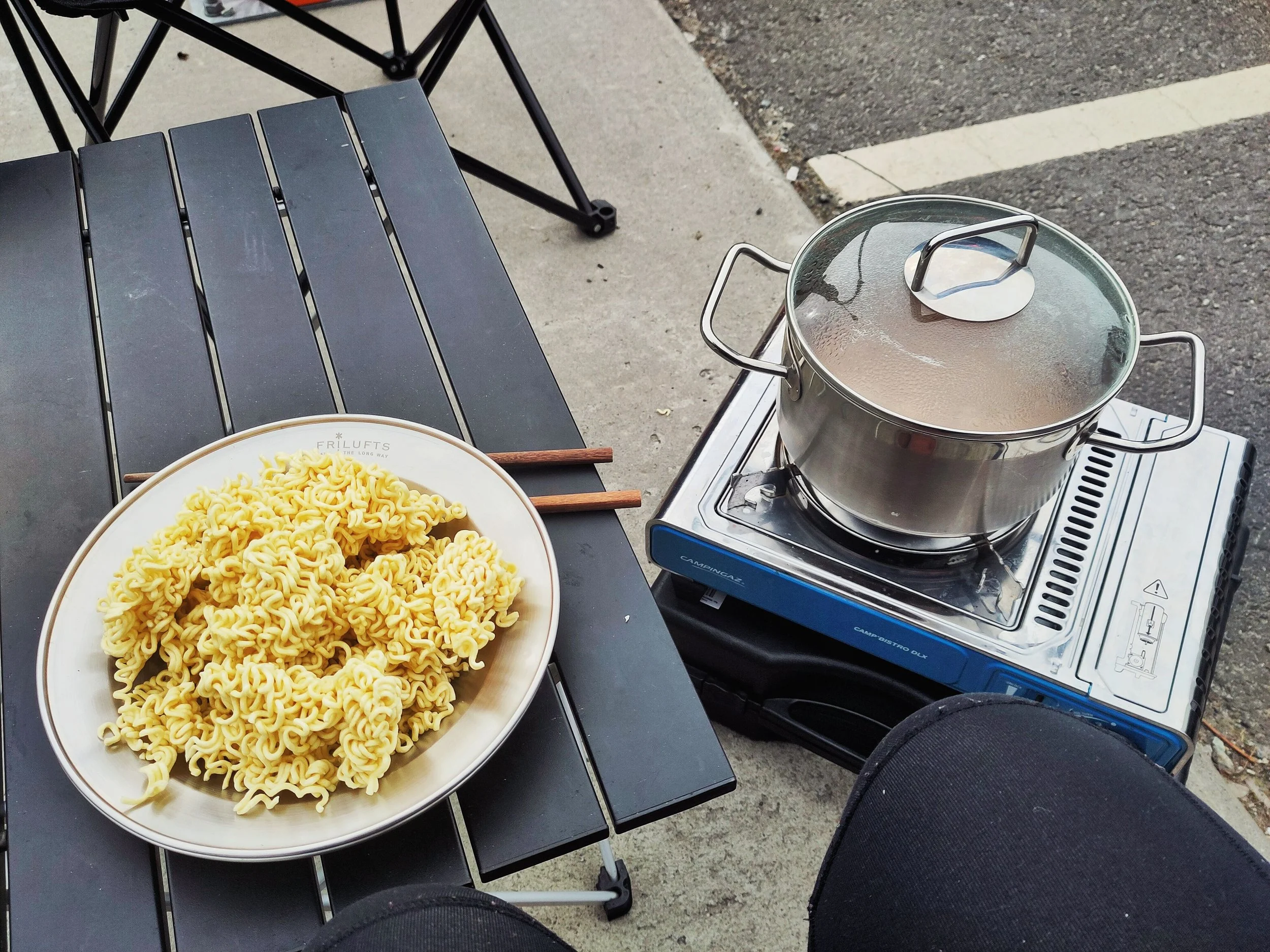 Mittlerweile waren weitere Campingenthusiast*innen angekommen und bereiteten sich ihre Nachtdomizile vor. Unsere direkten Nachbarn waren quasi auch in Deutschland unsere Nachbarn, denn sie wohnten von uns nur ein paar Dörfer entfernt. Wir tauschten uns über unsere Reisepläne aus und sogar 2 Flaschen aus ihrer Fritzlimo-Kiste schenkten sie uns, während wir unsere nicht-mehr-ganz-so-warmen Tortelloni verspeisten.