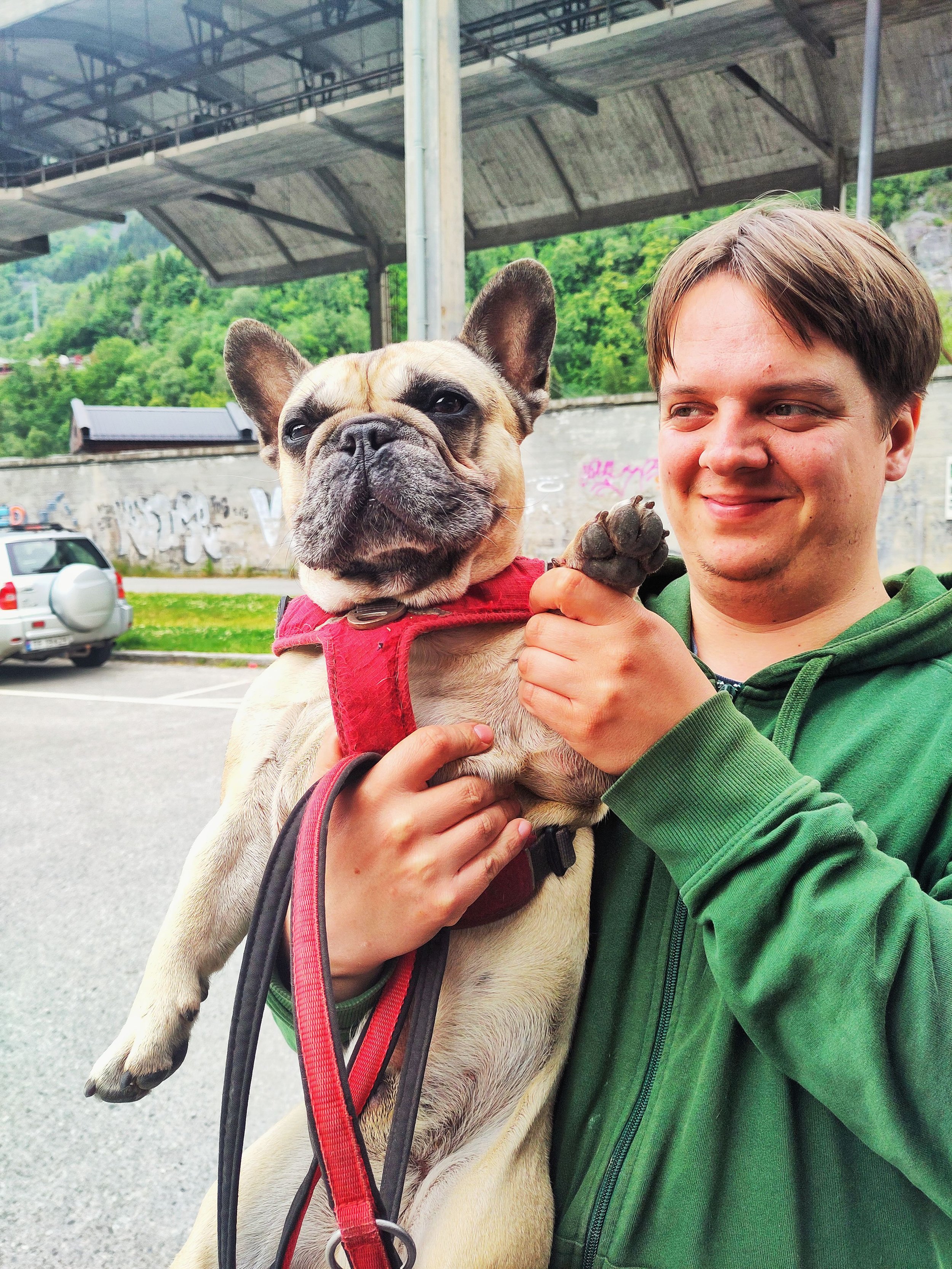 Zum Frühstück gab es saftige Pancakes, und danach packten wir alles zusammen, um die nächste Fähre zu erwischen. Von Hjelmelandsvågen setzten wir über zu Nesvik. Eine kurze Fährstrecke, aber trotzdem toll – bis auf den immer stärker werdenden Fischgestank. Wir rätselten: „War es das Wasser? War es das Schiff?“ – „Nein!“ Es war Atlas, der sich unbemerkt an unserem tollen Seeplatz in Fischinnereien gewälzt hatte. Nach der Fähre also direkt die nächste Möglichkeit zum Halten genommen und erstmal den Hund geduscht. Der fand das gar nicht witzig – zu Recht, das Wasser war nämlich mega kalt. Aber selbst schuld. Was wälzt er sich auch in toten Fischresten?