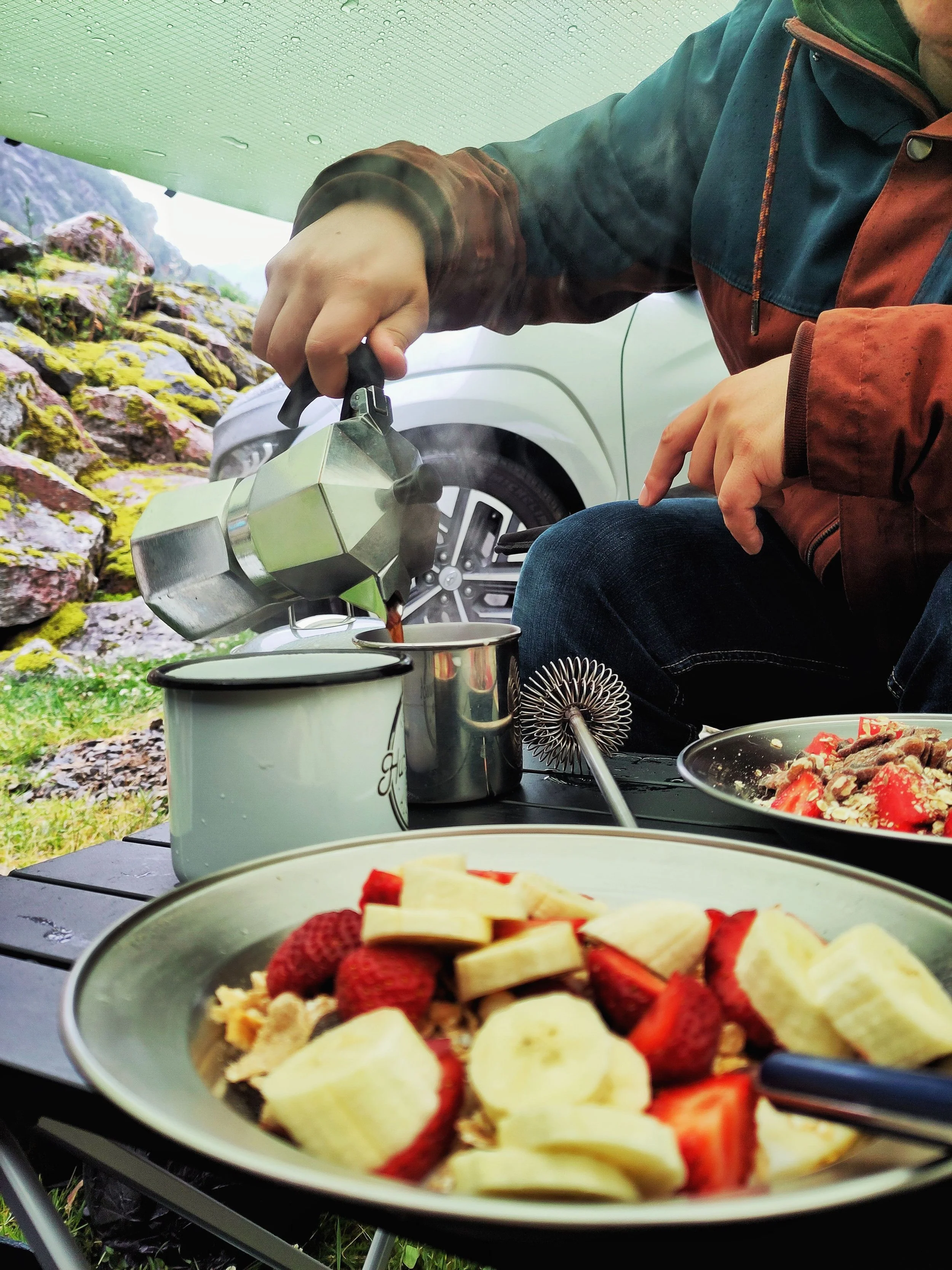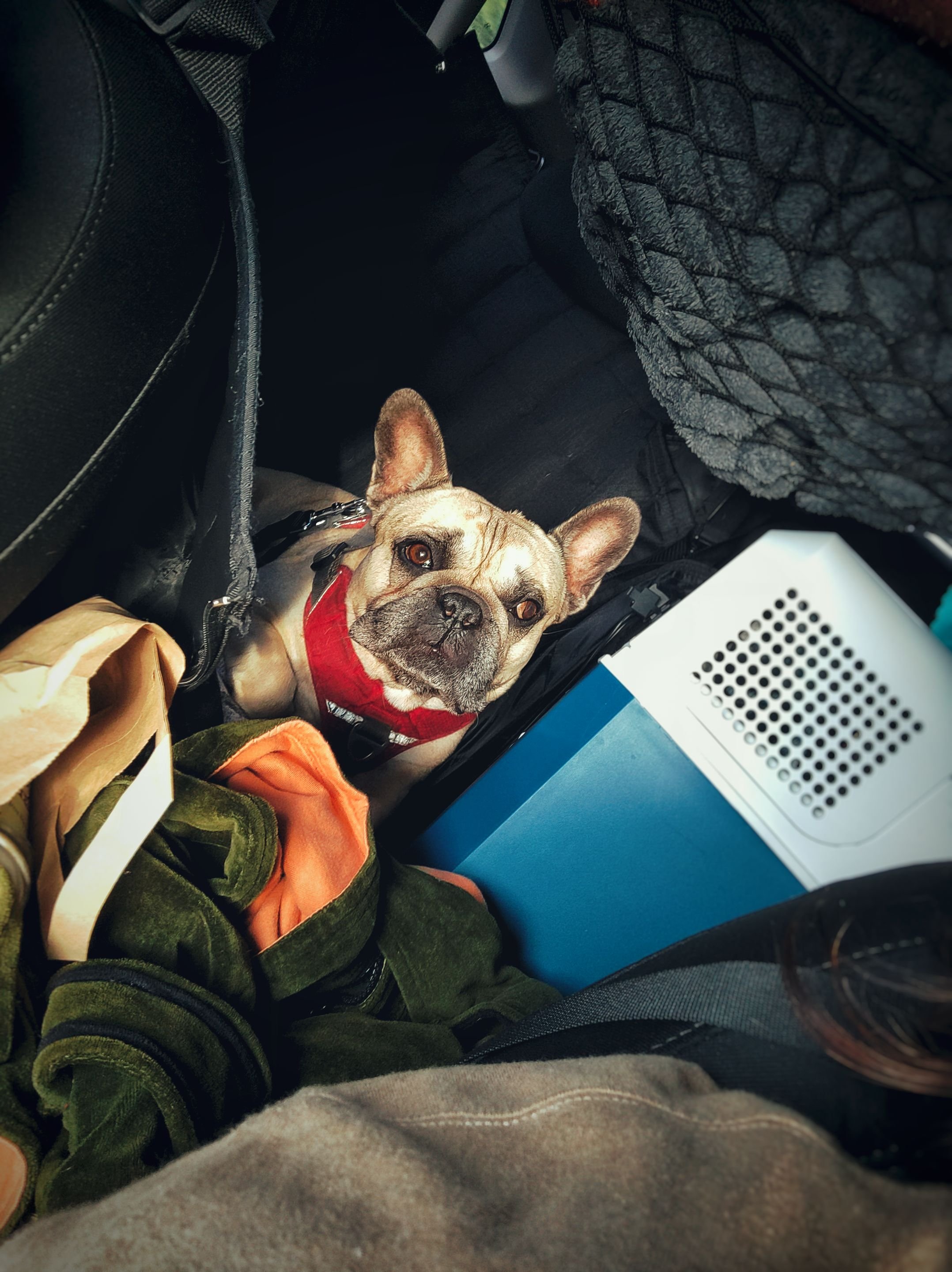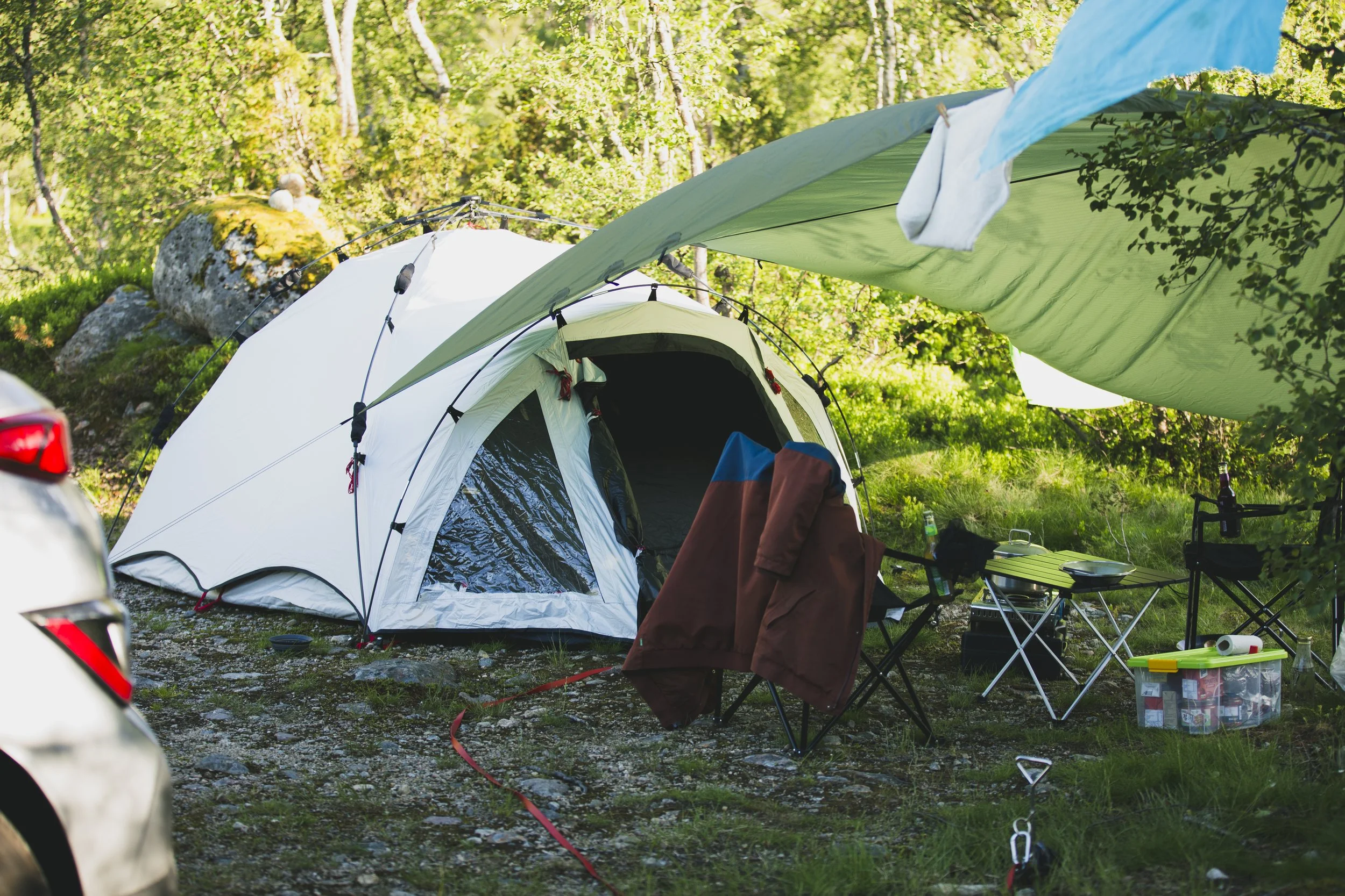 Frisch und knackig klingelte mein Wecker um 5 Uhr morgens. Jonas war bereits 1 Stunde früher aufgestanden, um das Haus aufzuräumen – nichts ist besser, als nach dem Urlaub in ein sauberes Zuhause zu kommen. Ganz entspannt packten wir die letzten Sachen. Diesmal würden wir mit unserem eigenen kleinen Auto – wohlbemerkt ein E-Auto – zelten, statt den Luxus eines Campers zu genießen. Dafür hatten wir uns extra ein neues Zelt und eine Luftmatratze gekauft und alles strategisch, Tetris-perfekt eingepackt. Das Auto quillte fast über, eine improvisierte Hänge-Netz-Situation schunkelte über Atlas’ Kopf, während neben ihm die Kühltruhe vor sich hin prustete. Der Boden im Kofferraum teilte unsere Konserven von dem Rest unseres Gepäcks, und an jedem Rücksitz gab es einen Auto-Organizer, in dem unsere täglich benutzten Gegenstände um ihren rechtmäßigen Platz kämpften.