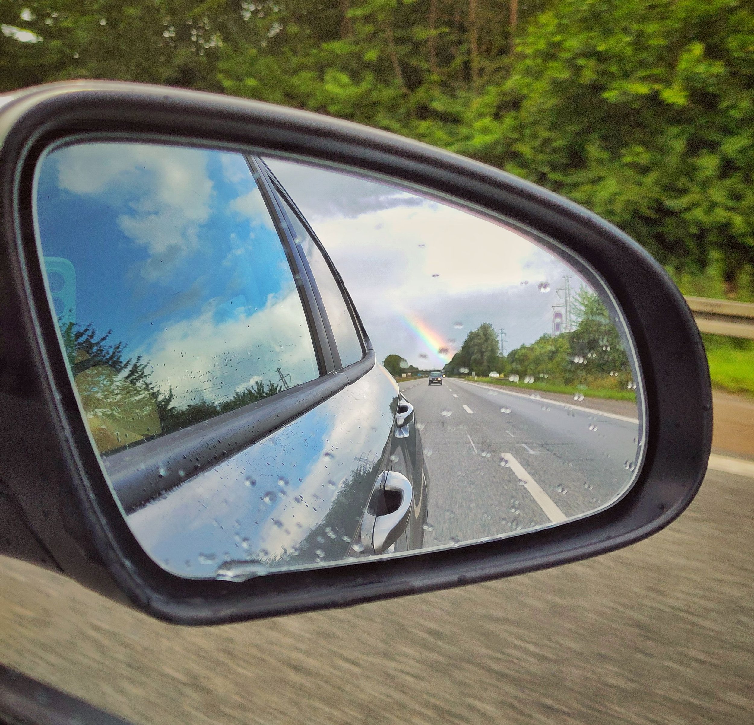 Nach der Hälfte der Strecke bemerkte ich, beim Proviantrauskramen, dass unser Kofferraum leicht geflutet war. Der 10 Liter Wassersack war nicht anständig verschlossen und ergoss sich in die untere Ebene. Also standen wir da mit unseren Bechern und schaufelten das Wasser aus dem Auto. Dinge, die man nicht braucht …